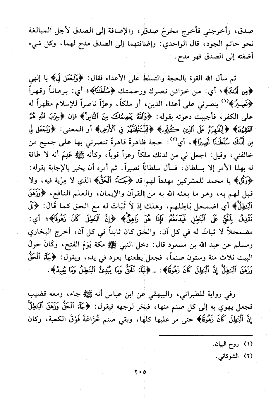 81 - ثم أمره أن يخبر بالإجابة بقوله: {وَقُلْ} يا محمد للمشركين مهددًا لهم قد {جاءَ الْحَقُّ} الذي لا مرية فيه، ولا قبل لهم به، وهو ما بعثه الله به من القرآن والإيمان، والعلم النافع، {وَزَهَقَ الْباطِلُ} أي اضمحل باطلهم، وهلك إذ لا ثبات له مع الحق كما قال: {بَلْ نَقْذِفُ بِالْحَقِّ عَلَى الْباطِلِ فَيَدْمَغُهُ فَإِذا هُوَ زاهِقٌ} {إِنَّ الْباطِلَ كانَ زَهُوقًا}؛ أي: مضمحلًا لا ثبات له في كل آن، والحق كان ثابتًا في كل آن، أخرج البخاري ومسلم عن عبد الله بن مسعود قال: دخل النبي - صلى الله عليه وسلم - مكة يوم الفتح، وكان حول البيت ثلاث مئة وستون صنمًا، فجعل يطعنها بعود في يده، ويقول: {جاءَ الْحَقُّ وَزَهَقَ الْباطِلُ إِنَّ الْباطِلَ كانَ زَهُوقًا}: - {جاءَ الْحَقُّ وَما يُبْدِئُ الْباطِلُ وَما يُعِيدُ}.