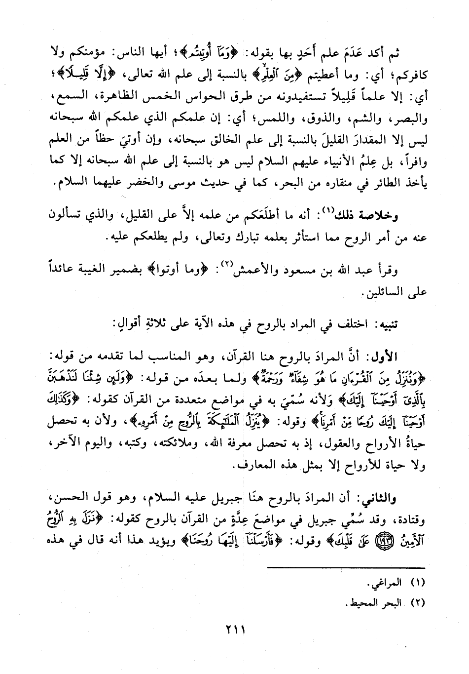 الأول: أنّ المراد بالروح هنا القرآن، وهو المناسب لما تقدمه من قوله: {وَنُنَزِّلُ مِنَ الْقُرْآنِ ما هُوَ شِفاءٌ وَرَحْمَةٌ} ولما بعَده من قوله: {وَلَئِنْ شِئْنا لَنَذْهَبَنَّ بِالَّذِي أَوْحَيْنا إِلَيْكَ} ولأنه سمّي به في مواضع متعددة من القرآن كقوله: {وَكَذلِكَ أَوْحَيْنا إِلَيْكَ رُوحًا مِنْ أَمْرِنا} وقوله: {يُنَزِّلُ الْمَلائِكَةَ بِالرُّوحِ مِنْ أَمْرِهِ}، ولأن به تحصل حياة الأرواح والعقول، إذ به تحصل معرفة الله، وملائكته، وكتبه، واليوم الآخر، ولا حياة للأرواح إلا بمثل هذه المعارف.