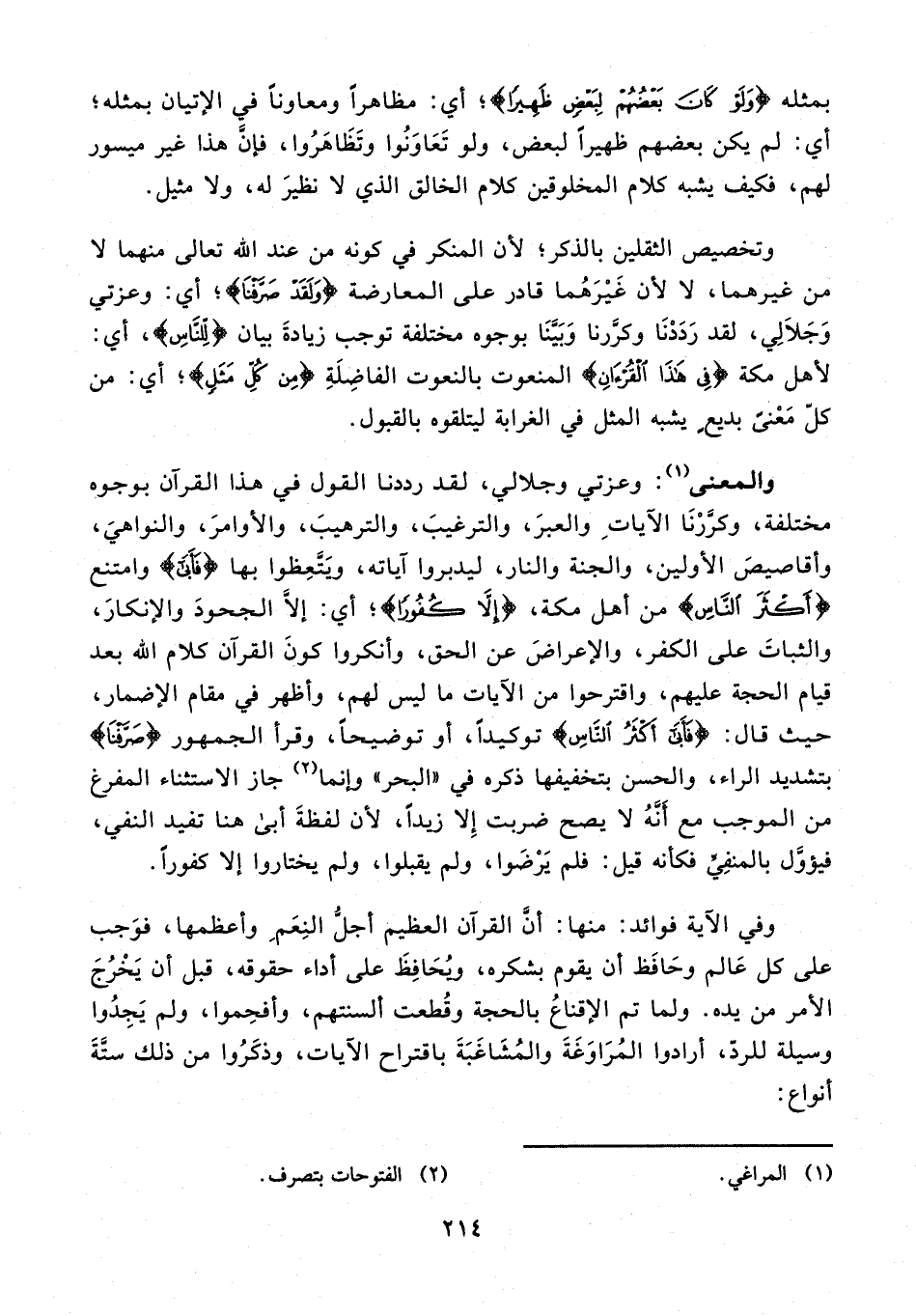 89 - {وَلَقَدْ صَرَّفْنا}؛ أي: وعزتي وجلالي، لقد رددنا وكرّرنا وبيّنا بوجوه مختلفة توجب زيادة بيان {لِلنَّاسِ}، أي: لأهل مكة {فِي هذَا الْقُرْآنِ} المنعوت بالنعوت الفاضلة {مِنْ كُلِّ مَثَلٍ}؛ أي: من كلّ معنى بديع يشبه المثل في الغرابة ليتلقوه بالقبول.