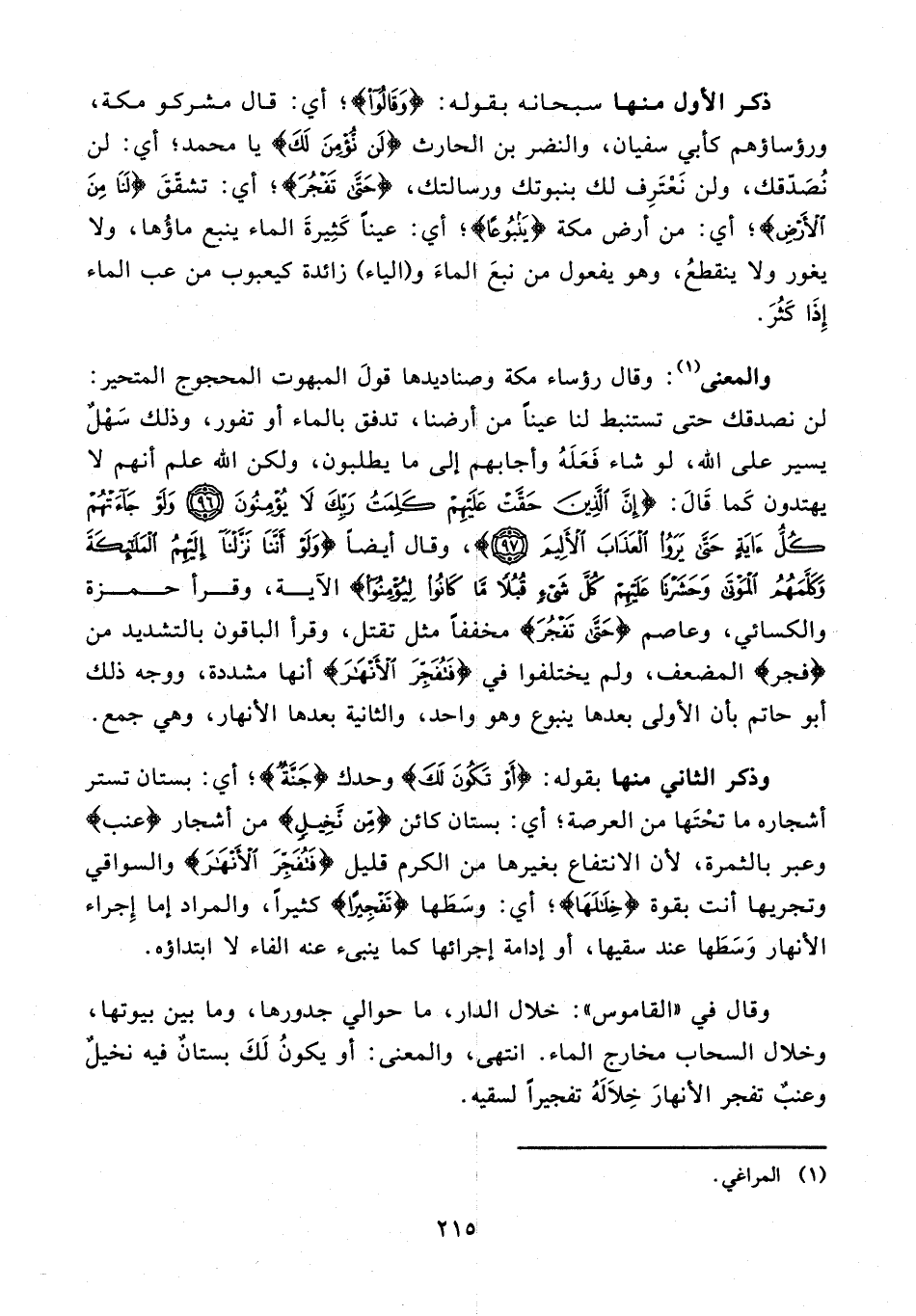 والمعنى (¬1): وقال رؤساء مكة وصناديدها قول المبهوت المحجوج المتحير: لن نصدقك حتى تستنبط لنا عينًا من أرضنا، تدفق بالماء أو تفور، وذلك سهلٌ يسير على الله، لو شاء فعله وأجابهم إلى ما يطلبون، ولكن الله علم أنهم لا يهتدون كما قال: {إِنَّ الَّذِينَ حَقَّتْ عَلَيْهِمْ كَلِمَتُ رَبِّكَ لا يُؤْمِنُونَ (96) وَلَوْ جاءَتْهُمْ كُلُّ آيَةٍ حَتَّى يَرَوُا الْعَذابَ الْأَلِيمَ (97)}، وقال أيضًا {وَلَوْ أَنَّنا نَزَّلْنا إِلَيْهِمُ الْمَلائِكَةَ وَكَلَّمَهُمُ الْمَوْتى وَحَشَرْنا عَلَيْهِمْ كُلَّ شَيْءٍ قُبُلًا ما كانُوا لِيُؤْمِنُوا} الآية، وقرأ حمزة والكسائي، وعاصم {حَتَّى تَفْجُرَ} مخففًا مثل تقتل، وقرأ الباقون بالتشديد من {فجر} المضعف، ولم يختلفوا في {فَتُفَجِّرَ الْأَنْهارَ} أنها مشددة، ووجه ذلك أبو حاتم بأن الأولى بعدها ينبوع وهو واحد، والثانية بعدها الأنهار، وهي جمع.
