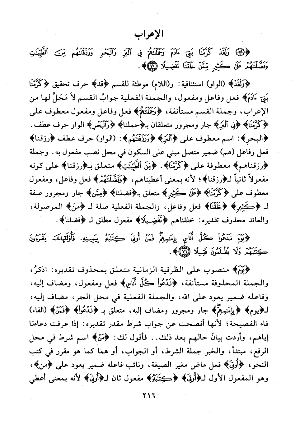 {وَلَقَدْ} {الواو} استئنافية: و {اللام} موطئة للقسم {قد} حرف تحقيق {كَرَّمْنا بَنِي آدَمَ} فعل وفاعل ومفعول، والجملة الفعلية جواب القسم لا محلَّ لها من الإعراب، وجملة القسم مستأنفة، {وَحَمَلْناهُمْ} فعل وفاعل ومفعول معطوف على {كَرَّمْنا} {فِي الْبَرِّ} جار ومجرور متعلقان بـ {حملنا} {وَالْبَحْرِ} {الواو} حرف عطف. {الْبَحْرِ}: اسم معطوف على {الْبَرِّ} {وَرَزَقْناهُمْ}: {الواو} حرف عطف {رزقنا} فعل وفاعل {هم} ضمير متصل مبني على السكون في محل نصب مفعول به. وجملة {رَزَقْناهُمْ} معطوفة على {كَرَّمْنا}. {مِنَ الطَّيِّباتِ} متعلق بـ {رزقنا} على كونه مفعولًا ثانيًا لـ {رزقنا}؛ لأنه بمعنى أعطيناهم، {وَفَضَّلْناهُمْ} فعل وفاعل، ومفعول معطوف على {كَرَّمْنا} {عَلى كَثِيرٍ} متعلق بـ {فضلنا} {مِمَّنْ} جار ومجرور صفة لـ {كَثِيرٍ} {خَلَقْنا} فعل وفاعل، والجملة الفعلية صلة لـ {من} الموصولة، والعائد محذوف تقديره: خلقناهم {تَفْضِيلًا} مفعول مطلق لـ {فضلنا}.
