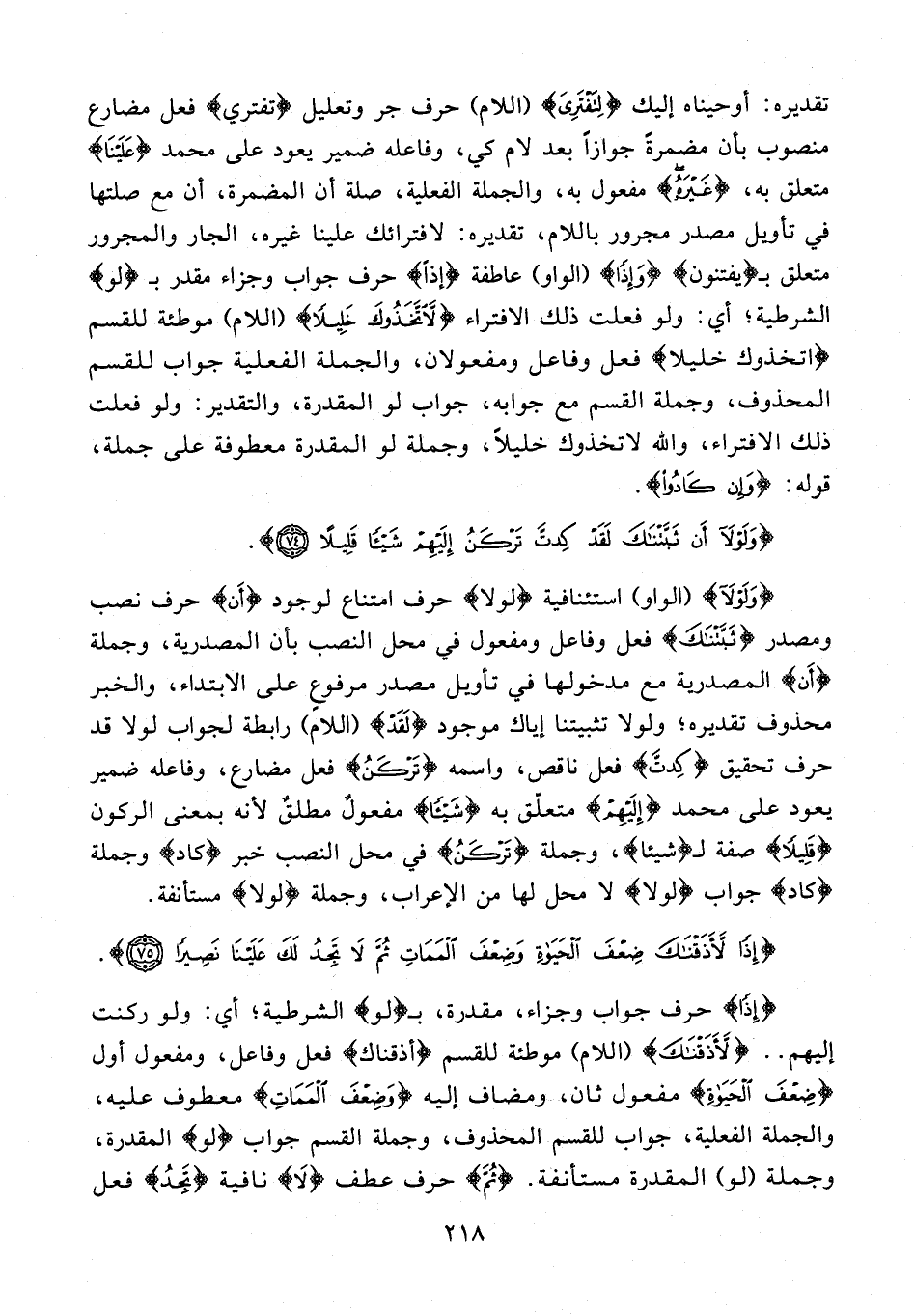 {وَلَوْلا} {الواو} استئنافية {لَوْلا} حرف امتناع لوجود {أَنْ} حرف نصب ومصدر {ثَبَّتْناكَ} فعل وفاعل ومفعول في محل النصب بأن المصدرية، وجملة {أَنْ} المصدرية مع مدخولها في تأويل مصدر مرفوعٍ على الابتداء، والخبر محذوف تقديره؛ ولولا تثبيتنا إياك موجود {لَقَدْ} {اللام} رابطة لجواب لولا قد حرف تحقيق {كِدْتَ} فعل ناقص، واسمه {تَرْكَنُ} فعل مضارع، وفاعله ضمير يعود على محمد {إِلَيْهِمْ} متعلّق به {شَيْئًا} مفعولٌ مطلقٌ لأنه بمعنى الركون {قَلِيلًا} صفة لـ {شَيْئًا}، وجملة {تَرْكَنُ} في محل النصب خبر {كاد} وجملة {كاد} جواب {لَوْلا} لا محل لها من الإعراب، وجملة {لَوْلا} مستأنفة.