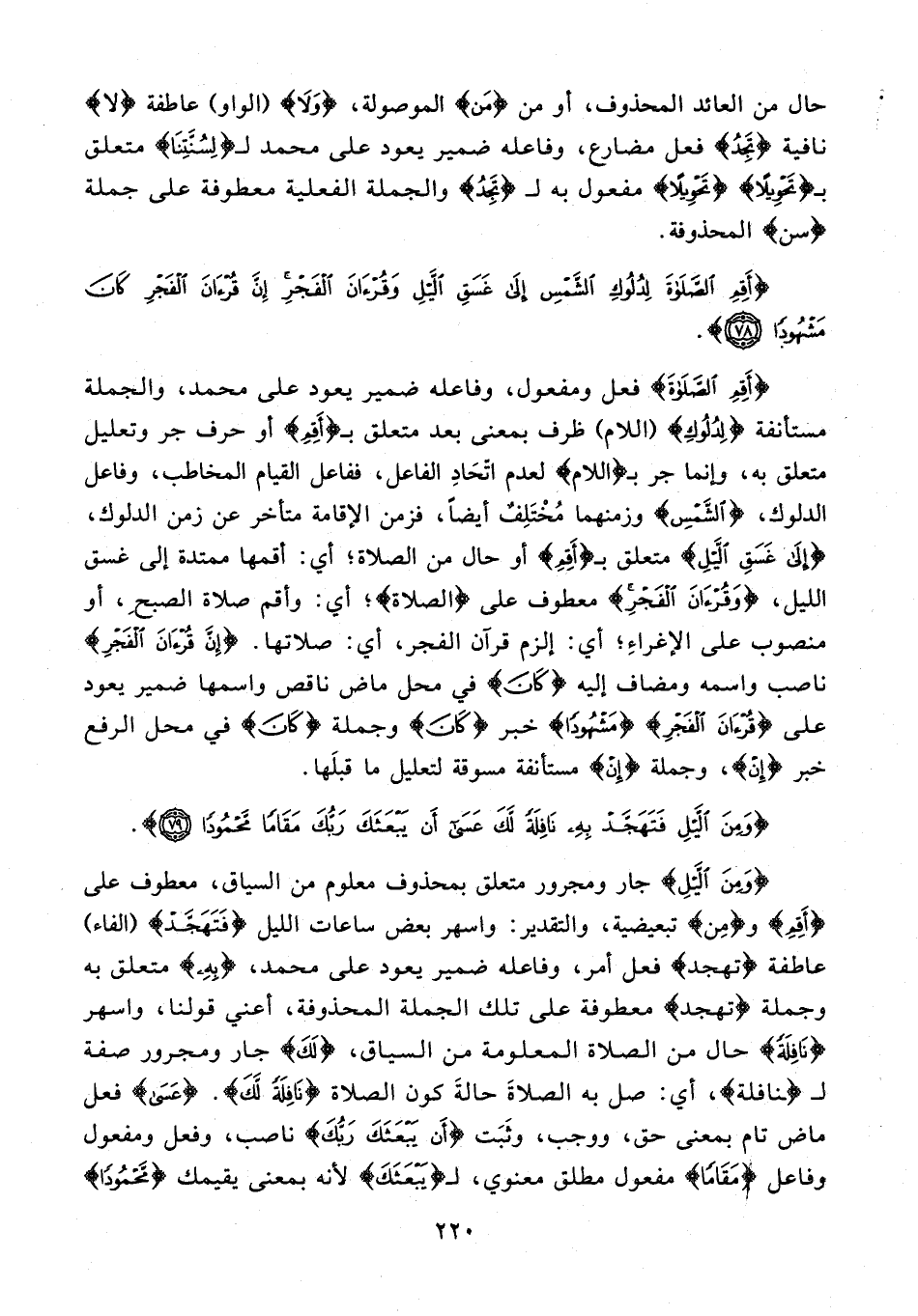 {أَقِمِ الصَّلاةَ} فعل ومفعول، وفاعله ضمير يعود على محمد، والجملة مستأنفة {لِدُلُوكِ} {اللام} ظرف بمعنى بعد متعلق بـ {أَقِمِ} أو حرف جر وتعليل متعلق به، وإنما جر بـ {اللام} لعدم اتّحاد الفاعل، ففاعل القيام المخاطب، وفاعل الدلوك، {الشَّمْسِ} وزمنهما مختلفٌ أيضًا، فزمن الإقامة متأخر عن زمن الدلوك، {إِلى غَسَقِ اللَّيْلِ} متعلق بـ {أَقِمِ} أو حال من الصلاة؛ أي: أقمها ممتدة إلى غسق الليل، {وَقُرْآنَ الْفَجْرِ} معطوف على {الصَّلاةَ}؛ أي: وأقم صلاة الصبح، أو منصوب على الإغراء؛ أي: إلزم قرآن الفجر، أي: صلاتها. {إِنَّ قُرْآنَ الْفَجْرِ} ناصب واسمه ومضاف إليه {كَانَ} في محل ماض ناقص واسمها ضمير يعود على {قُرْآنَ الْفَجْرِ} {مَشْهُودًا} خبر {كَانَ} وجملة {كَانَ} في محل الرفع خبر {إِنَّ}، وجملة {إِنَّ} مستأنفة مسوقة لتعليل ما قبلَها.