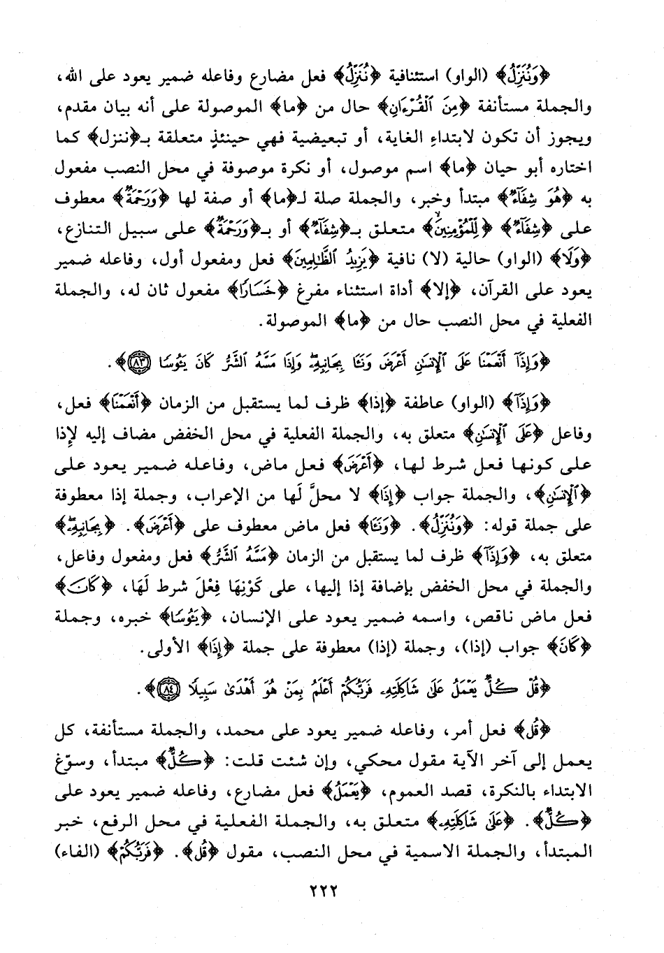 {وَنُنَزِّلُ} {الواو} استئنافية {نُنَزِّلُ} فعل مضارع وفاعله ضمير يعود على الله، والجملة مستأنفة {مِنَ الْقُرْآنِ} حال من {ما} الموصولة على أنه بيان مقدم، ويجوز أن تكون لابتداءِ الغاية، أو تبعيضية فهي حينئذٍ متعلقة بـ {نُنَزِّلُ} كما اختاره أبو حيان {ما} اسم موصول، أو نكرة موصوفة في محل النصب مفعول به {هُوَ شِفاءٌ} مبتدأ وخبر، والجملة صلة لـ {ما} أو صفة لها {وَرَحْمَةٌ} معطوف على {شِفَاءٌ} {لِلْمُؤْمِنِينَ} متعلق بـ {شِفَاءٌ} أو بـ {وَرَحْمَةٌ} على سبيل التنازع، {وَلا} {الواو} حالية {لا} نافية {يَزِيدُ الظَّالِمِينَ} فعل ومفعول أول، وفاعله ضمير يعود على القرآن، {إِلَّا} أداة استثناء مفرغ {خَسَارًا} مفعول ثان له، والجملة الفعلية في محل النصب حال من {ما} الموصولة.