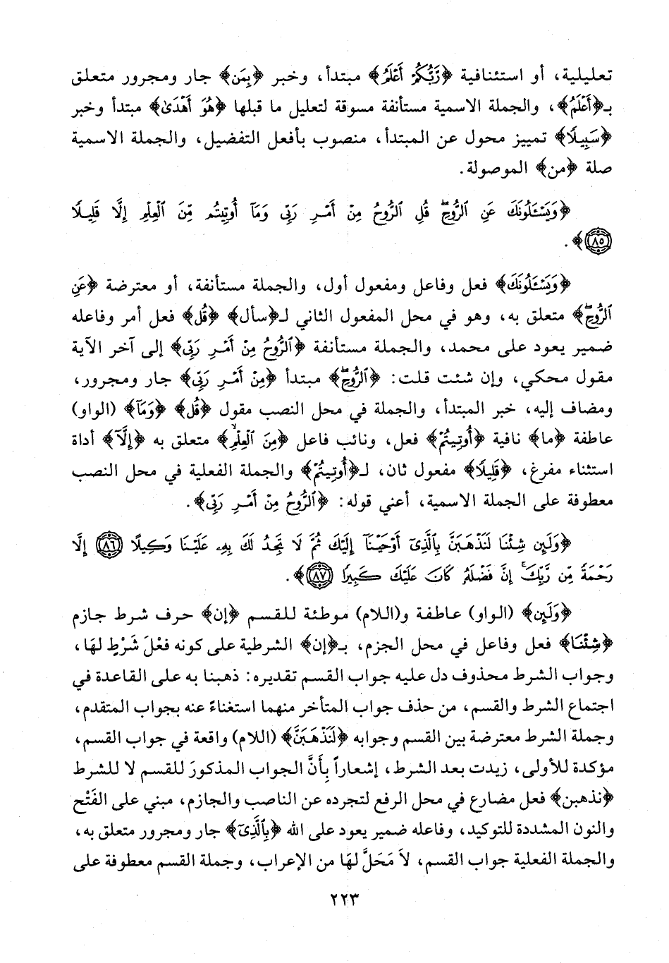 {وَيَسْئَلُونَكَ} فعل وفاعل ومفعول أول، والجملة مستأنفة، أو معترضة {عَنِ الرُّوحِ} متعلق به، وهو في محل المفعول الثاني لـ {سأل} {قُلِ} فعل أمر وفاعله ضمير يعود على محمد، والجملة مستأنفة {الرُّوحُ مِنْ أَمْرِ رَبِّي} إلى آخر الآية مقول محكي، وإن شئت قلت: {الرُّوحِ} مبتدأ {مِنْ أَمْرِ رَبِّي} جار ومجرور، ومضاف إليه، خبر المبتدأ، والجملة في محل النصب مقول {قُلِ} {وَمَا} {الواو} عاطفة {ما} نافية {أُوتِيتُمْ} فعل، ونائب فاعل {مِنَ الْعِلْمِ} متعلق به إِلَّا أداة استثناء مفرغ، {قَلِيلًا} مفعول ثان، لـ {أُوتِيتُمْ} والجملة الفعلية في محل النصب معطوفة على الجملة الاسمية، أعني قوله: {الرُّوحُ مِنْ أَمْرِ رَبِّي}.