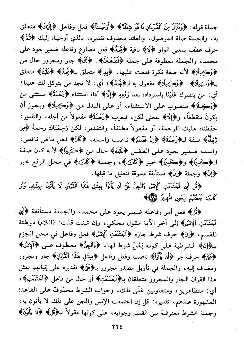 جملة قوله: {وَنُنَزِّلُ مِنَ الْقُرْآنِ ما هُوَ شِفاءٌ} {أَوْحَيْنا} فعل وفاعل {إِلَيْكَ} متعلق به، والجملة صلة الموصول، والعائد محذوف تقديره، بالذي أوحيناه إليك {ثُمَّ} حرف عطف بمعنى الواو {لا} نافية {تَجِدُ} فعل مضارع وفاعله ضمير يعود على محمد، والجملة معطوفة على جملة {لَنَذْهَبَنَّ}. {لَكَ} جار ومجرور حال من {وَكِيلًا} لأنه صفة نكرة قدمت عليها، {بِهِ} متعلق بـ {تَجِدُ} {عَلَيْنا} متعلق بـ {وَكِيلًا}. {وَكِيلًا} مفعول به لـ {تَجِدُ}؛ أي: لا تجد من يتوكل لك علينا؛ أي: من ينصرك علينا باسترداده بعد رفعه {إِلَّا} أداة استثناء {رَحْمَةً} مستثنى من {وَكِيلًا} منصوب على الاستثناء، أو على البدل من {وَكِيلًا} ويجوز أن يكون منقطعًا، و {إِلَّا} بمعنى لكن، فيعرب {رَحْمَةً} مفعولًا من أجله، والتقدير: حفظناه عليك للرحمة، أو مفعولًا مطلقًا، والتقدير: لكن رحمناك رحمةً {مِنْ رَبِّكَ} صفة لـ {رَحْمَةً} {إِنَّ فَضْلَهُ} ناصب واسمه، {كَانَ} فعل ماض ناقص، واسمه ضمير يعود على الفضل {عَلَيْكَ} حال من {كَبِيرًا} لأنه كان صفة لـ {كَبِيرًا} و {كَبِيرًا} خبر {كَانَ}، وجملة {كَانَ} في محل الرفع خبر {إِنَّ} وجملة {إِنَّ} مستأنفة مسوقة لتعليل ما قبلها.
