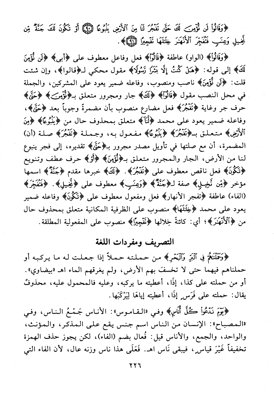 {وَقالُوا} {الواو} عاطفة {قالُوا} فعل وفاعل معطوف على {أبى} {لَنْ نُؤْمِنَ لَكَ} إلى قوله: {هَلْ كُنْتُ إِلَّا بَشَرًا رَسُولًا} مقول محكي لـ {قالُوا}، وإن شئت قلت: {لَنْ نُؤْمِنَ} ناصب ومنصوب، وفاعله ضمير يعود على المشركين، والجملة في محل النصب مقول {قالُوا} {لَكَ} جار ومجرور متعلق بـ {نُؤْمِنَ} {حَتَّى}، حرف جر وغاية {تَفْجُرَ} فعل مضارع منصوب بأن مضمرةً وجوبًا بعد {حَتَّى}، وفاعله ضمير يعود على محمد {لَنَّا} متعلق بمحذوف حال من {يَنْبُوعًا} {مِنَ الْأَرْضِ} متعلق بـ {تَفْجُرَ} {يَنْبُوعًا} مفعول به، وجملة {تَفْجُرَ} صلة {أن} المضمرة، أن مع صلتها في تأويل مصدر مجرور بـ {حَتَّى} تقديره، إلى فجر ينبوع لنا من الأرض، الجار والمجرور متعلق بـ {نُؤْمِنَ} {أَوْ} حرف عطف وتنويع {تَكُونَ} فعل ناقص معطوف على {تَفْجُرَ}. {لَكَ} خبرها مقدم {جَنَّةٌ} اسمها مؤخر {مِنْ نَخِيلٍ} صفة لـ {جَنَّةٌ} {وَعِنَبٍ} معطوف على {نَخِيلٍ}. {فَتُفَجِّرَ} {الفاء} عاطفة {تفجر الأنهار} فعل ومفعول معطوف على {تَكُونَ} وفاعله ضمير يعود على محمد {خِلالَها} منصوب على الظرفية المكانية متعلق بمحذوف حال من {الْأَنْهارَ}؛ أي: كائنةً خلالها {تَفْجِيرًا} منصوب على المفعولية المطلقة.