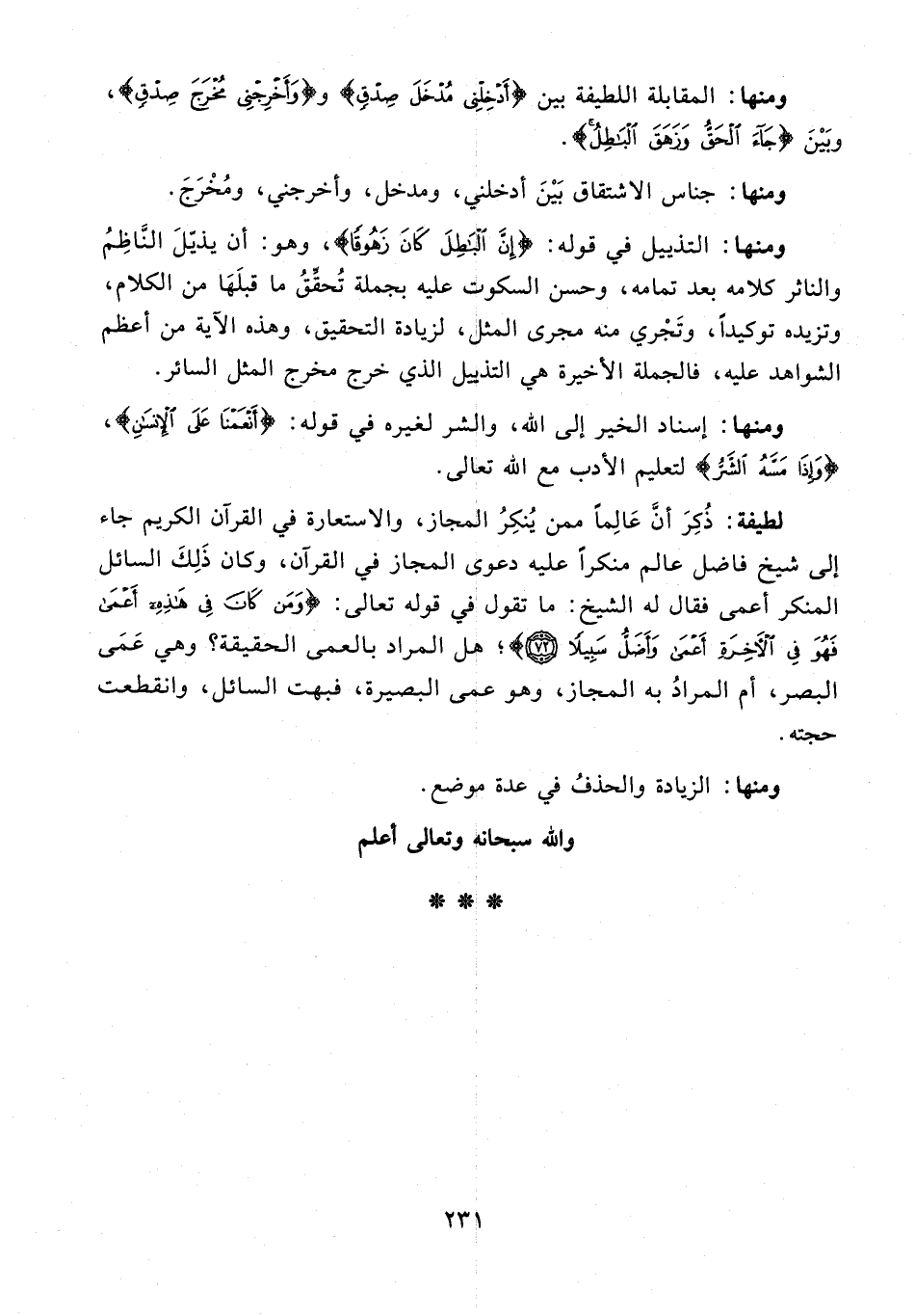 ومنها: إسناد الخير إلى الله، والشر لغيره في قوله: {أَنْعَمْنا عَلَى الْإِنْسانِ}، {وَإِذا مَسَّهُ الشَّرُّ} لتعليم الأدب مع الله تعالى. لطيفة: ذكر أنّ عالمًا ممن ينكر المجاز، والاستعارة في القرآن الكريم جاء إلى شيخ فاضل عالم منكرًا عليه دعوى المجاز في القرآن، وكان ذلك السائل المنكر أعمى فقال له الشيخ: ما تقول في قوله تعالى: {وَمَنْ كانَ فِي هذِهِ أَعْمى فَهُوَ فِي الْآخِرَةِ أَعْمى وَأَضَلُّ سَبِيلًا (72)}؛ هل المراد بالعمى الحقيقة؟ وهي عمى البصر، أم المراد به المجاز، وهو عمى البصيرة، فبهت السائل، وانقطعت حجته.