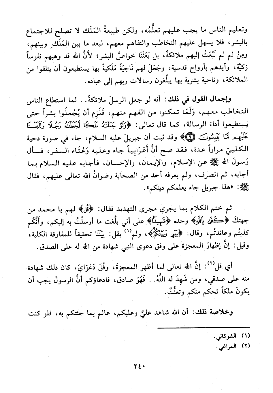 وتعليم الناس ما يجب عليهم تعلُّمُه، ولكن طبيعة الملك لا تصلح للاجتماع بالبشر، فلا يسهل عليهم التخاطب والتفاهم معهم، لبعد ما بين الملك وبينهم، ومن ثم لم نبعث إليهم ملائكةً، بل بعثنا خواصّ البشر؛ لأنّ الله قد وهبهم نفوسًا زكيّة، وأيدهم بأرواح قدسية، وجعل لهم ناحيةً ملكيةً بها يستطيعون أن يتلقوا من الملائكة، وناحية بشرية بها يبلّغون رسالات ربهم إلى عباده.