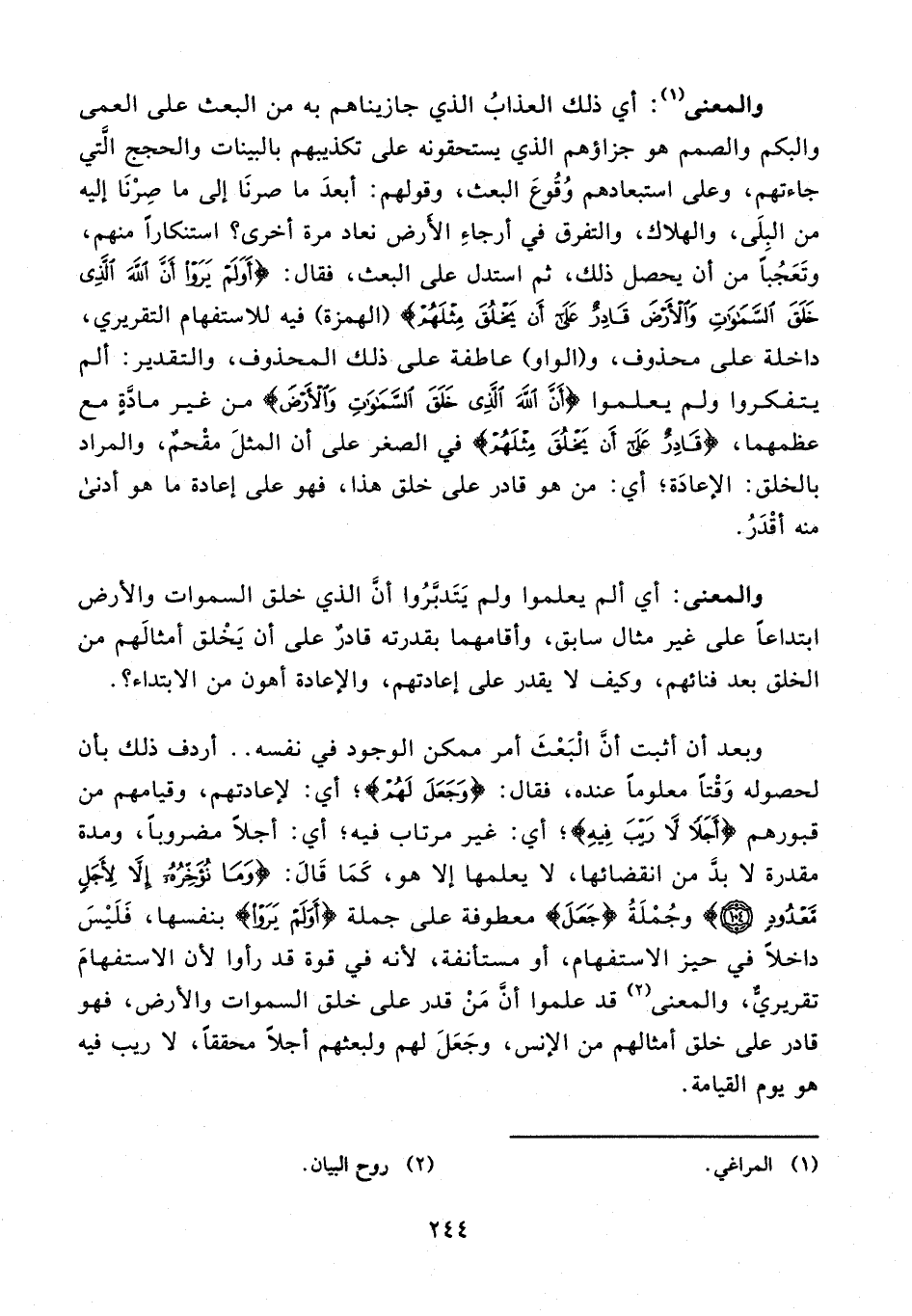 والمعنى: أي ألم يعلموا ولم يتدبّروا أنّ الذي خلق السموات والأرض ابتداعا على غير مثال سابق، وأقامهما بقدرته قادرٌ على أن يخلق أمثالهم من الخلق بعد فنائهم، وكيف لا يقدر على إعادتهم، والإعادة أهون من الابتداء؟.