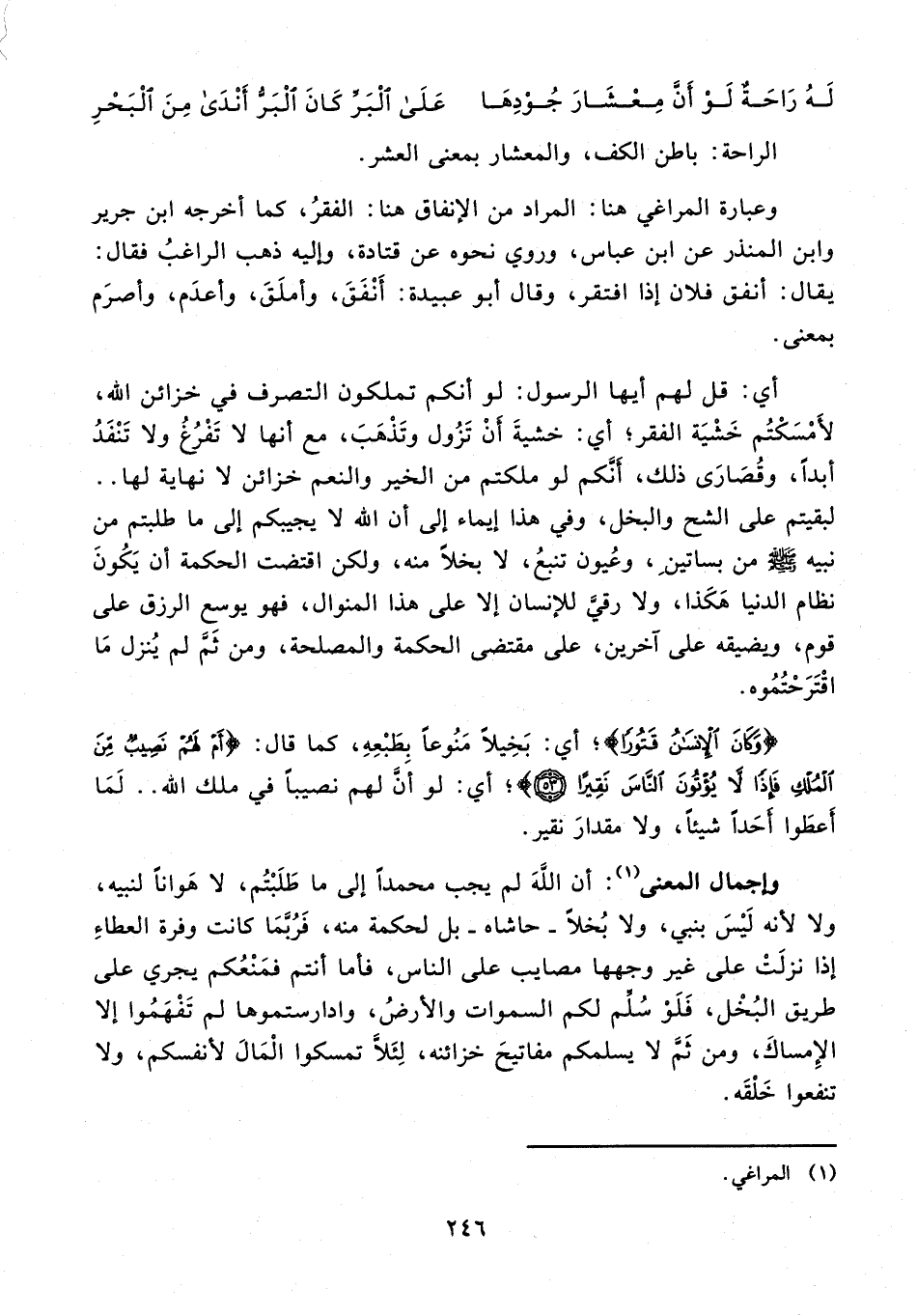 وعبارة المراغي هنا: المراد من الإنفاق هنا: الفقر، كما أخرجه ابن جرير وابن المنذر عن ابن عباس، وروي نحوه عن قتادة، وإليه ذهب الراغب فقال: يقال: أنفق فلان إذا افتقر، وقال أبو عبيدة: أنفق، وأملق، وأعدم، وأصرم بمعنى.