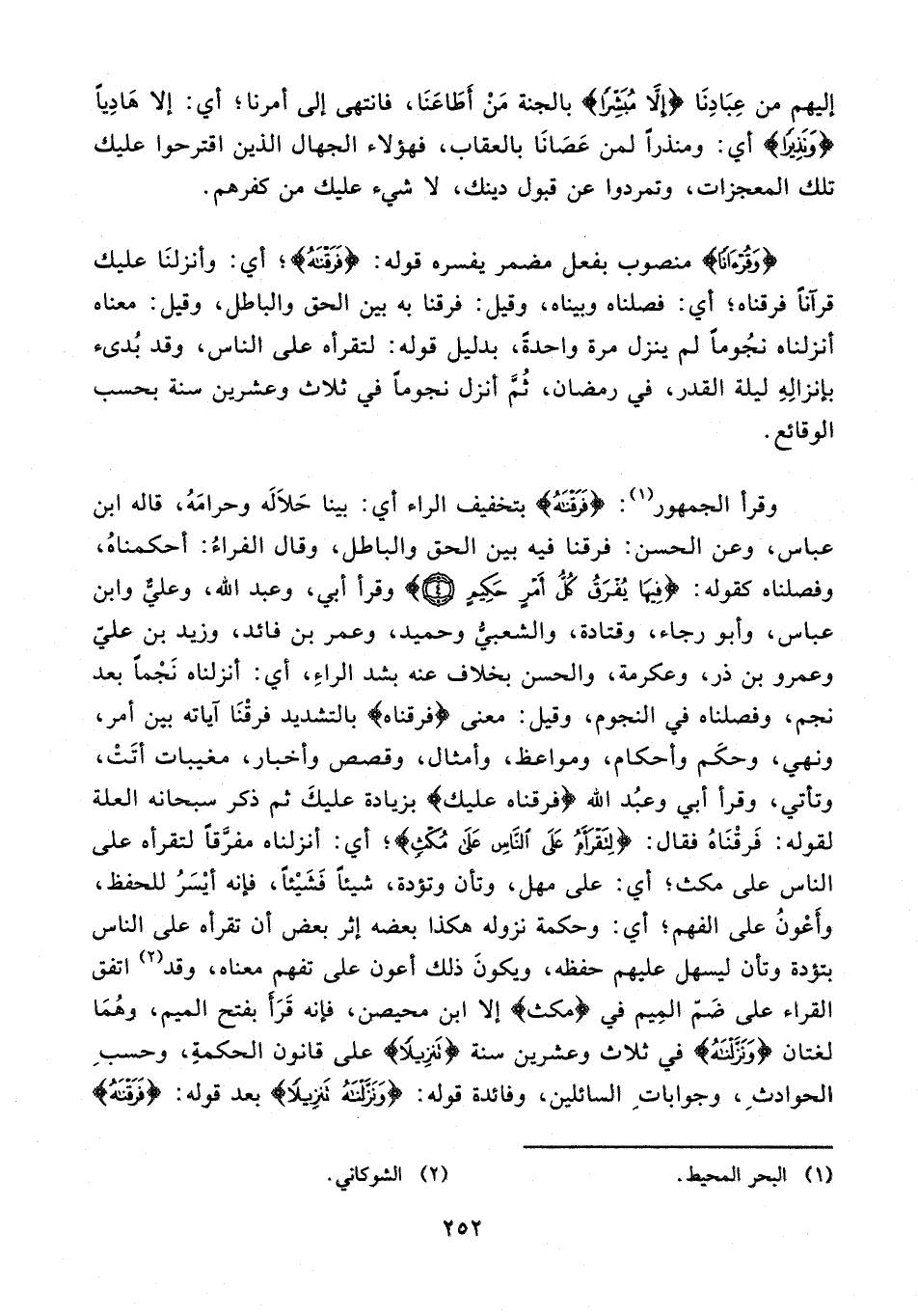 106 - {وَقُرْآنًا} منصوب بفعل مضمر يفسره قوله: {فَرَقْناهُ}؛ أي: وأنزلنا عليك قرآنًا فرقناه؛ أي: فصلناه وبيناه، وقيل: فرقنا به بين الحق والباطل، وقيل: معناه أنزلناه نجوما لم ينزل مرة واحدة، بدليل قوله: لتقرأه على الناس، وقد بدىء بإنزاله ليلة القدر، في رمضان، ثمّ أنزل نجوما في ثلاث وعشرين سنة بحسب الوقائع.