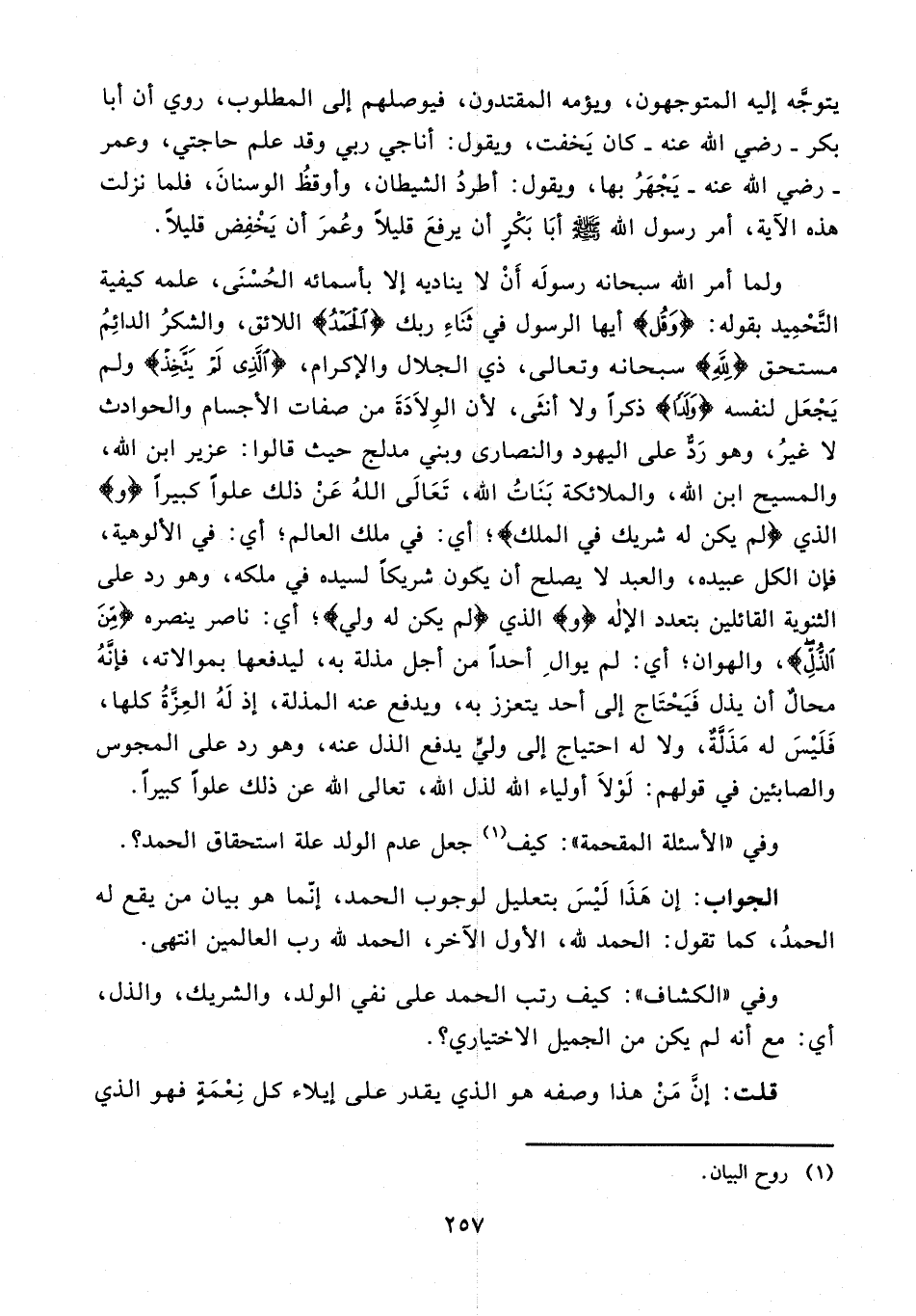 111 - ولما أمر الله سبحانه رسوله أن لا يناديه إلا بأسمائه الحسنى، علمه كيفية التّحميد بقوله: {وَقُلِ} أيها الرسول في ثناء ربك {الْحَمْدُ} اللائق، والشكر الدائم مستحق {لِلَّهِ} سبحانه وتعالى، ذي الجلال والإكرام، {الَّذِي لَمْ يَتَّخِذْ} ولم يجعل لنفسه {وَلَدًا} ذكرًا ولا أنثى، لأن الولادة من صفات الأجسام والحوادث لا غير، وهو ردّ على اليهود والنصارى وبني مدلج حيث قالوا: عزير ابن الله، والمسيح ابن الله، والملائكة بنات الله، تعالى الله عن ذلك علوًا كبيرًا {وَ} الذي {لَمْ يَكُنْ لَهُ شَرِيكٌ فِي الْمُلْكِ}؛ أي: في ملك العالم؛ أي: في الألوهية، فإن الكل عبيده، والعبد لا يصلح أن يكون شريكًا لسيده في ملكه، وهو رد على الثنوية القائلين بتعدد الإله {وَ} الذي {لَمْ يَكُنْ لَهُ وَلِيٌّ}؛ أي: ناصر ينصره {مِنَ الذُّلِّ}، والهوان؛ أي: لم يوال أحدًا من أجل مذلة به، ليدفعها بموالاته، فإنّه محال أن يذل فيحتاج إلى أحد يتعزز به، ويدفع عنه المذلة، إذ له العزّة كلها، فليس له مذلّة، ولا له احتياج إلى وليّ يدفع الذل عنه، وهو رد على المجوس والصابئين في قولهم: لولا أولياء الله لذل الله، تعالى الله عن ذلك علوًا كبيرًا.