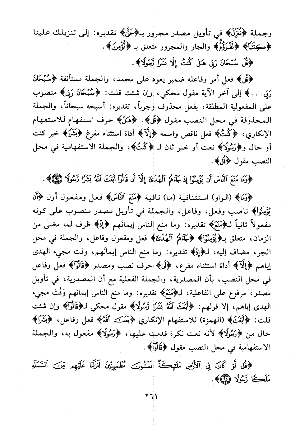 {قُلْ} فعل أمر وفاعله ضمير يعود على محمد، والجملة مستأنفة {سُبْحانَ رَبِّي ...} إلى آخر الآية مقول محكي، وإن شئت قلت: {سُبْحانَ رَبِّي} منصوب على المفعولية المطلقة، بفعل محذوف وجوبًا، تقديره: أسبحه سبحانًا، والجملة المحذوفة في محل النصب مقول {قُلْ}. {هَلْ} حرف استفهام للاستفهام الإنكاري، {كُنْتُ} فعل ناقص واسمه {إِلَّا} أداة استثناء مفرغ {بَشَرًا} خبر كنت أو حال و {رَسُولًا} نعت أو خبر ثان لـ {كُنْتُ}، والجملة الاستفهامية في محل النصب مقول {قُلْ}.