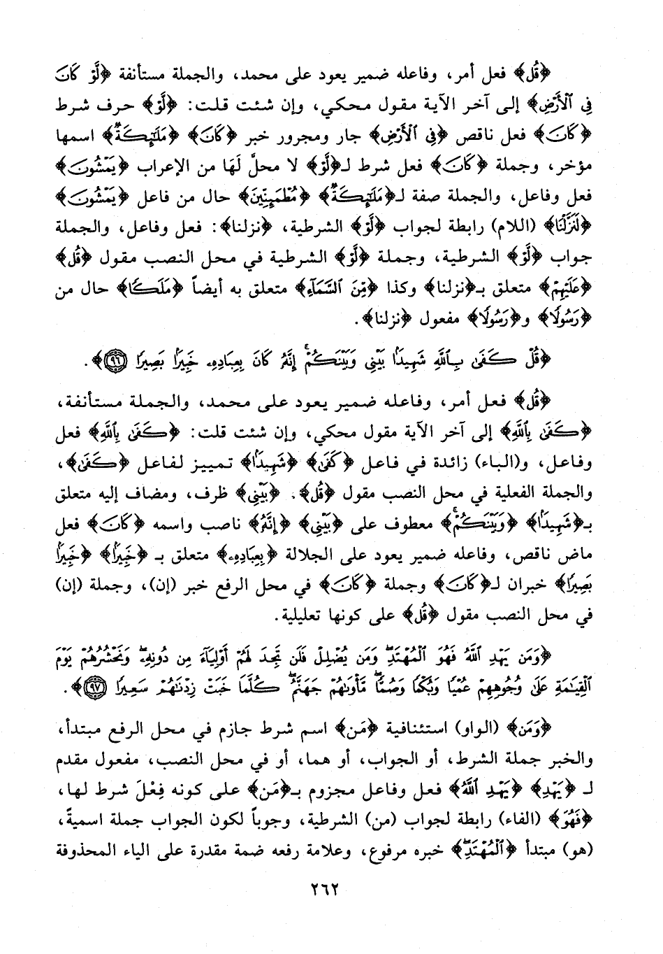 {قُلْ} فعل أمر، وفاعله ضمير يعود على محمد، والجملة مستأنفة، {كَفَى بِاللَّهِ} إلى آخر الآية مقول محكي، وإن شئت قلت: {كَفى بِاللَّهِ} فعل وفاعل، و {الباء} زائدة في فاعل {كَفى} {شَهِيدًا} تمييز لفاعل {كَفى}، والجملة الفعلية في محل النصب مقول {قُلْ}، {بَيْنِي} ظرف، ومضاف إليه متعلق بـ {شَهِيدًا} {وَبَيْنَكُمْ} معطوف على {بَيْنِي} {إِنَّهُ} ناصب واسمه {كانَ} فعل ماض ناقص، وفاعله ضمير يعود على الجلالة {بِعِبادِهِ} متعلق بـ {خَبِيرًا} {خَبِيرًا بَصِيرًا} خبران لـ {كانَ} وجملة {كانَ} في محل الرفع خبر {إن}، وجملة {إن} في محل النصب مقول {قُلْ} على كونها تعليلية.