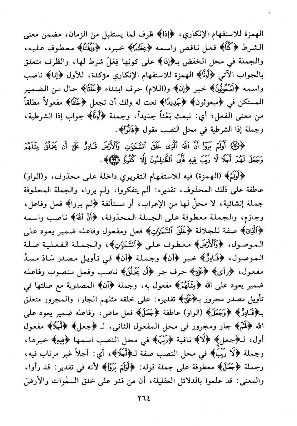 {أَوَلَمْ} {الهمزة} فيه للاستفهام التقريري داخلة على محذوف، و {الواو} عاطفة على ذلك المحذوف، تقديره: ألم يتفكروا، ولم يروا، والجملة المحذوفة جملة إنشائية، لا محلّ لها من الإعراب، أو مستأنفة {لَمْ يَرَوْا} فعل وفاعل، وجازم، والجملة معطوفة على الجملة المحذوفة، {أَنَّ اللَّهَ} ناصب واسمه {الَّذِي} صفة للجلالة {خَلَقَ السَّماواتِ} فعل ومفعول وفاعله ضمير يعود على الموصول، {وَالْأَرْضَ} معطوف على {السَّماواتِ}، والجملة الفعلية صلة الموصول، {قادِرٌ} خبر {أَنَّ} وجملة {أَنَّ} في تأويل مصدر سادّ مسدّ مفعول، {رأى} {عَلى} حرف جر {أَنْ يَخْلُقَ} ناصب وفعل منصوب وفاعله ضمير يعود على الله {مِثْلَهُمْ} مفعول به، وجملة {أَنَّ} المصدرية مع صلتها في تأويل مصدر مجرور بـ {عَلى} تقديره: على خلقه مثلهم الجار، والمجرور متعلق بـ {قادِرٌ} {وَجَعَلَ} {الواو} عاطفة {جَعَلَ} فعل ماض، وفاعله ضمير يعود على الله {لَهُمْ} جار ومجرور في محل المفعول الثاني، لـ {جَعَلَ} {أَجَلًا} مفعول أول، لـ {جَعَلَ} {لا} نافية {رَيْبَ} في محل النصب اسمها {فِيهِ} خبرها، وجملة {لا رَيْبَ} في محل النصب صفة لـ {أَجَلًا}، أي: أجلًا غير مرتاب فيه، وجملة {جَعَلَ} معطوفة على جملة قوله: {أَوَلَمْ يَرَوْا} لأنه في تقدير: قد رأوا، والمعنى: قد علموا بالدلائل العقليلة، أن من قدر على خلق السموات والأرض