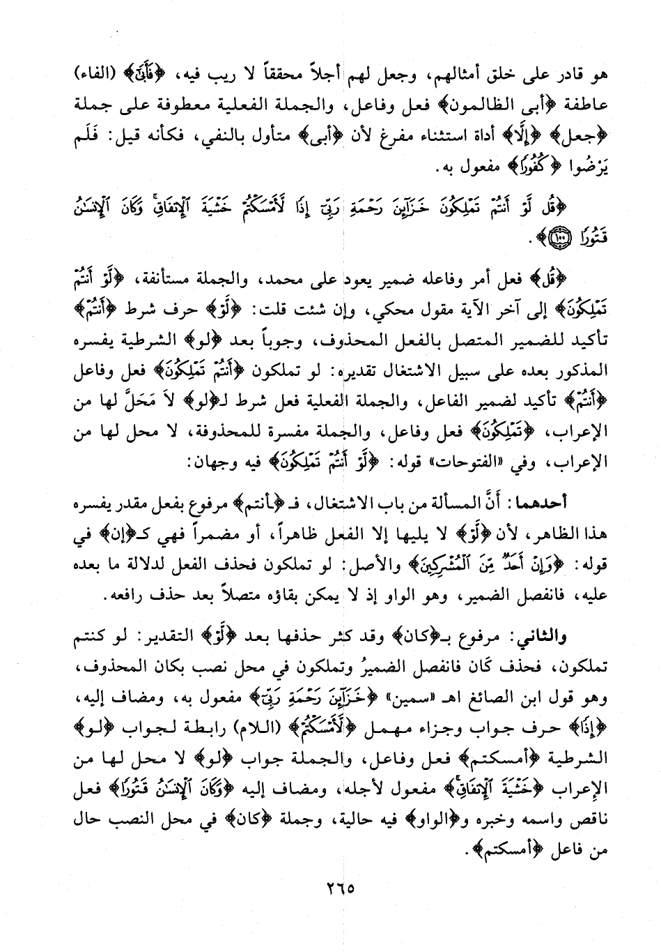 والثاني: مرفوع بـ {كان} وقد كثر حذفها بعد {لَوْ} التقدير: لو كنتم تملكون، فحذف كان فانفصل الضميرُ وتملكون في محل نصب بكان المحذوف، وهو قول ابن الصائغ اهـ «سمين» {خَزائِنَ رَحْمَةِ رَبِّي} مفعول به، ومضاف إليه، {إِذًا} حرف جواب وجزاء مهمل {لَأَمْسَكْتُمْ} {اللام} رابطة لجواب {لَوْ} الشرطية {أمسكتم} فعل وفاعل، والجملة جواب {لَوْ} لا محل لها من الإعراب {خَشْيَةَ الْإِنْفاقِ} مفعول لأجله، ومضاف إليه {وَكانَ الْإِنْسانُ قَتُورًا} فعل ناقص واسمه وخبره و {الواو} فيه حالية، وجملة {كانَ} في محل النصب حال من فاعل {أمسكتم}.