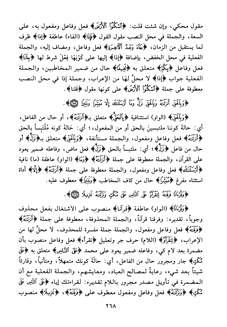 {وَقُرْآنًا} {الواو} عاطفة {قُرْآنًا} منصوب على الاشتغال بفعل محذوف وجوبًا، تقديره: وفرقنا قرآنًا، والجملة المحذوفة، معطوفة على جملة {أَنْزَلْناهُ} {فَرَقْناهُ} فعل وفاعل ومفعول، والجملة جملة مفسرة للمحذوف، لا محلَّ لها من الإعراب، {لِتَقْرَأَهُ} {اللام} حرف جر وتعليل {تقرأه} فعل وفاعل منصوب بأن مضمرة بعد لام كي، وفاعله ضمير يعود على محمد {عَلَى النَّاسِ} متعلق به {عَلى مُكْثٍ} جار ومجرور حال من الفاعل، أي: حالة كونك متمهلًا، ومتأنيًا، وقارئًا شيئًا بعد شيء، رعايةً لمصالح العباد، ومعايشهم، والجملة الفعلية مع أن المضمرة في تأويل مصدر مجرور باللام تقديره: لقراءتك إياه {عَلَى النَّاسِ عَلى مُكْثٍ} {وَنَزَّلْناهُ} فعل وفاعل ومفعول معطوف على {فَرَقْناهُ}، {تَنْزِيلًا} منصوب