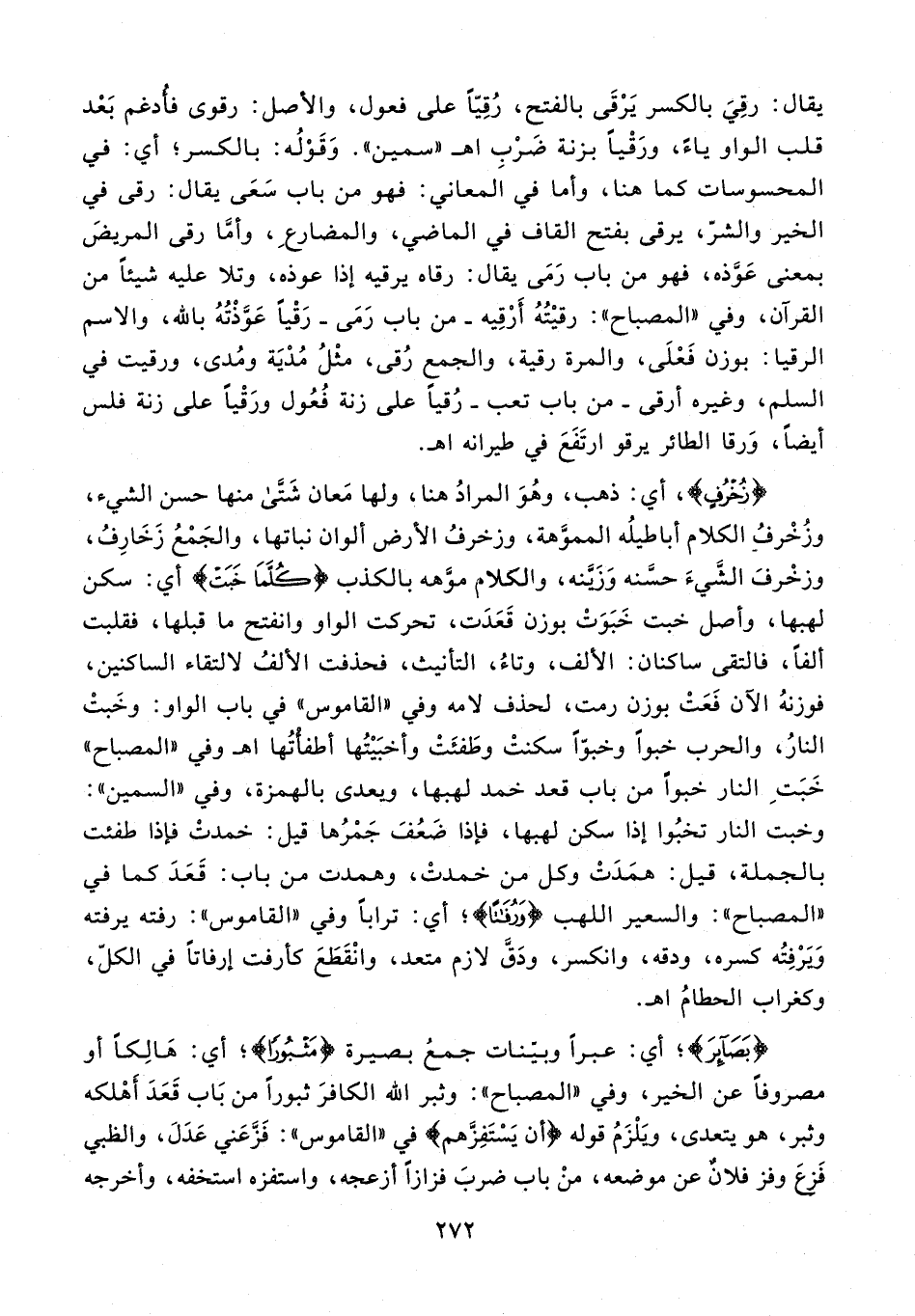 {زُخْرُفٍ}، أي: ذهب، وهو المراد هنا، ولها معان شتّى منها حسن الشيء، وزخرف الكلام أباطيله المموّهة، وزخرف الأرض ألوان نباتها، والجمع زخارف، وزخرف الشّيء حسّنه وزيّنه، والكلام موّهه بالكذب {كُلَّما خَبَتْ} أي: سكن لهبها، وأصل خبت خبوت بوزن قعدت، تحركت الواو وانفتح ما قبلها، فقلبت ألفا، فالتقى ساكنان: الألف، وتاء، التأنيث، فحذفت الألف لالتقاء الساكنين، فوزنه الآن فعت بوزن رمت، لحذف لامه وفي «القاموس» في باب الواو: وخبت النار، والحرب خبوًا وخبوًّا سكنت وطفئت وأخبيتها أطفأتها اهـ وفي «المصباح» خبت النار خبوًا من باب قعد خمد لهبها، ويعدى بالهمزة، وفي «السمين»: وخبت النار تخبوا إذا سكن لهبها، فإذا ضعف جمرها قيل: خمدت فإذا طفئت بالجملة، قيل: همدت وكل من خمدت، وهمدت من باب: قعد كما في «المصباح»: والسعير اللهب {وَرُفاتًا}؛ أي: ترابا وفي «القاموس»: رفته يرفته ويرفته كسره، ودقه، وانكسر، ودقّ لازم متعد، وانقطع كأرفت إرفاتًا في الكلّ، وكغراب الحطام اهـ.