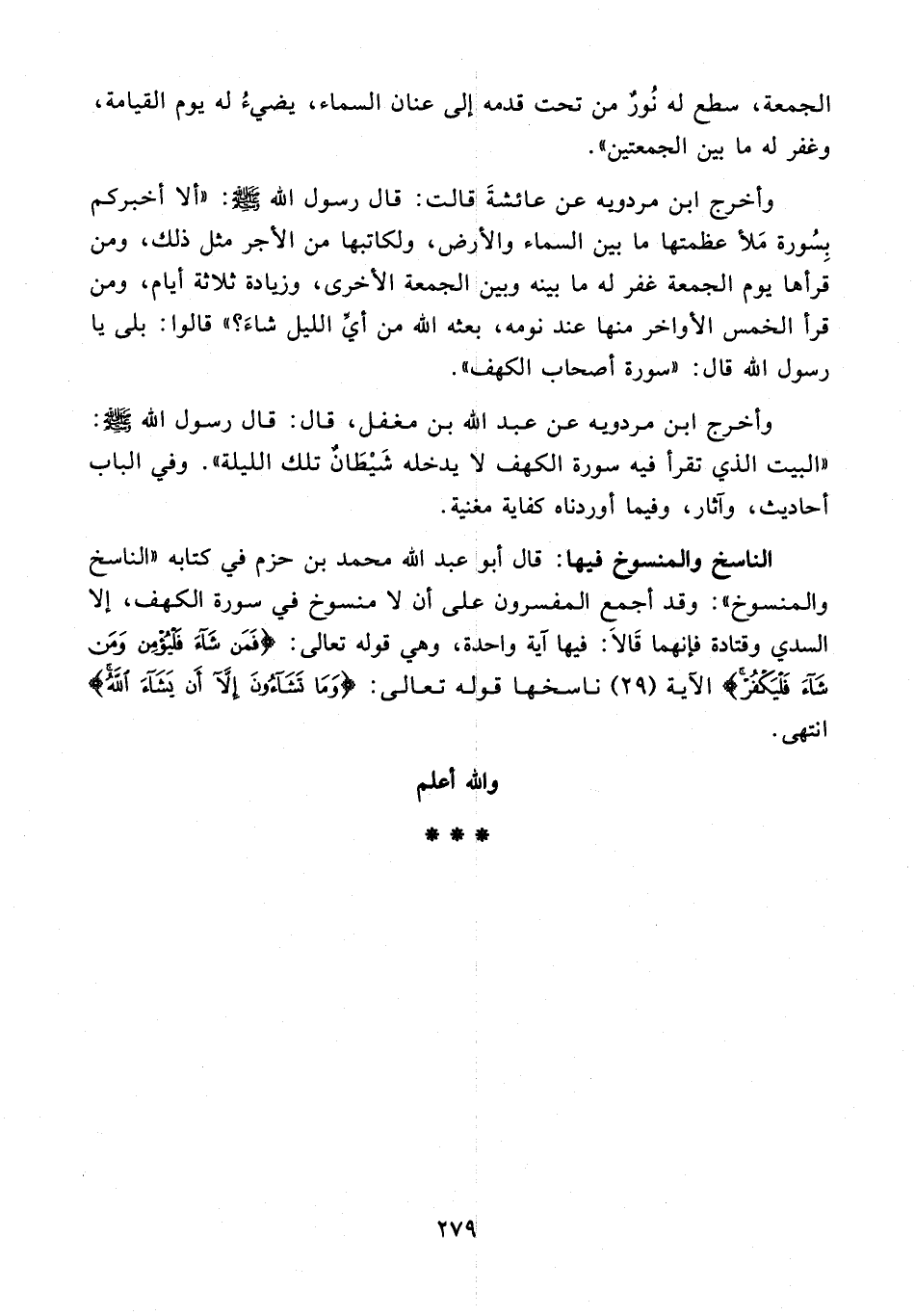 وأخرج ابن مردويه عن عائشة قالت: قال رسول الله - صلى الله عليه وسلم -: «ألا أخبركم بسورة ملأ عظمتها ما بين السماء والأرض، ولكاتبها من الأجر مثل ذلك، ومن قرأها يوم الجمعة غفر له ما بينه وبين الجمعة الأخرى، وزيادة ثلاثة أيام، ومن قرأ الخمس الأواخر منها عند نومه، بعثه الله من أيّ الليل شاء؟» قالوا: بلى يا رسول الله قال: «سورة أصحاب الكهف».