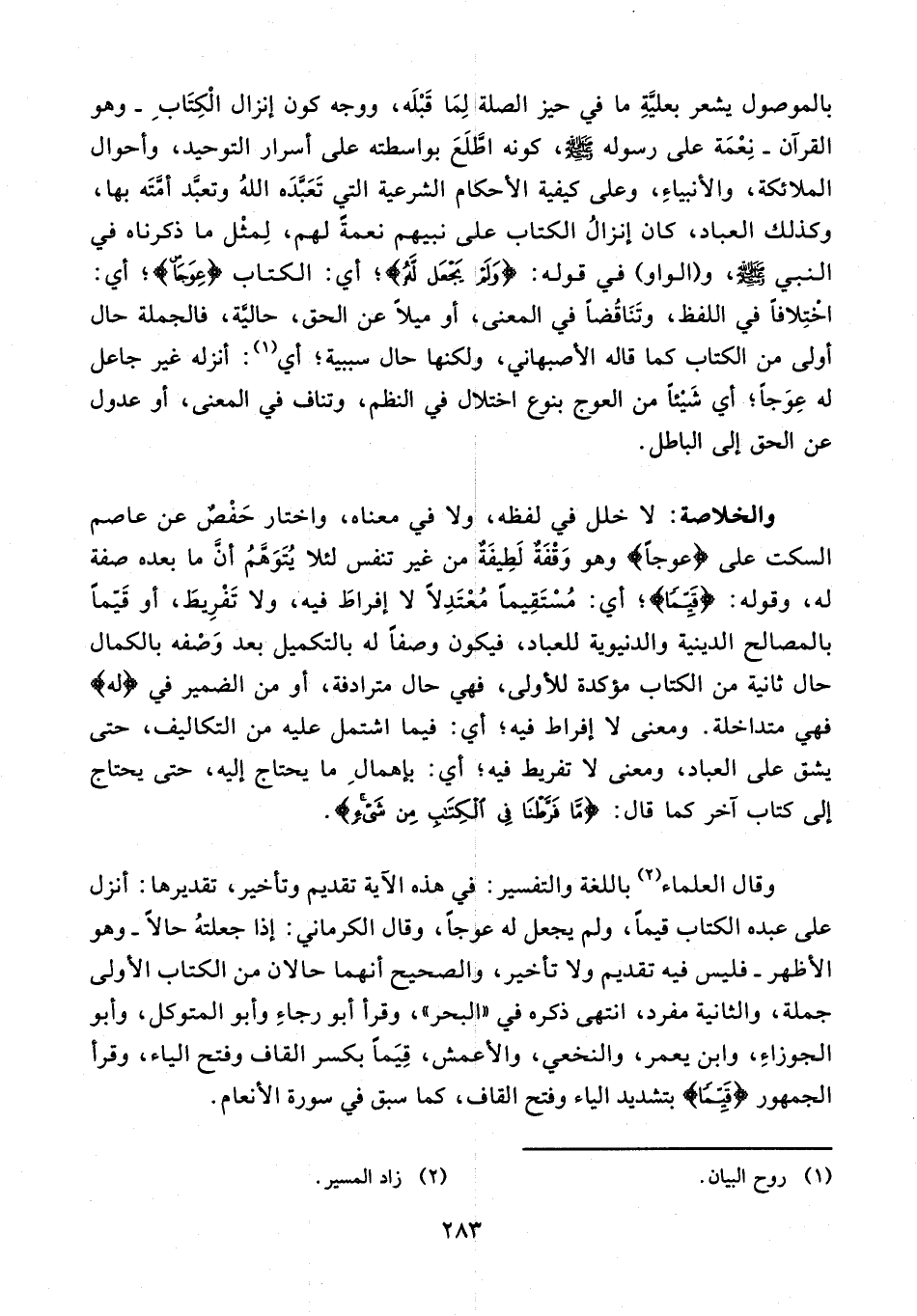 2 - وقوله: {قَيِّمًا}؛ أي: مستقيمًا معتدلًا لا إفراط فيه، ولا تفريط، أو قيّمًا بالمصالح الدينية والدنيوية للعباد، فيكون وصفا له بالتكميل بعد وصفه بالكمال حال ثانية من الكتاب مؤكدة للأولى، فهي حال مترادفة، أو من الضمير في {لَهُ} فهي متداخلة. ومعنى لا إفراط فيه؛ أي: فيما اشتمل عليه من التكاليف، حتى يشق على العباد، ومعنى لا تفريط فيه؛ أي: بإهمال ما يحتاج إليه، حتى يحتاج إلى كتاب آخر كما قال: {ما فَرَّطْنا فِي الْكِتابِ مِنْ شَيْءٍ}.