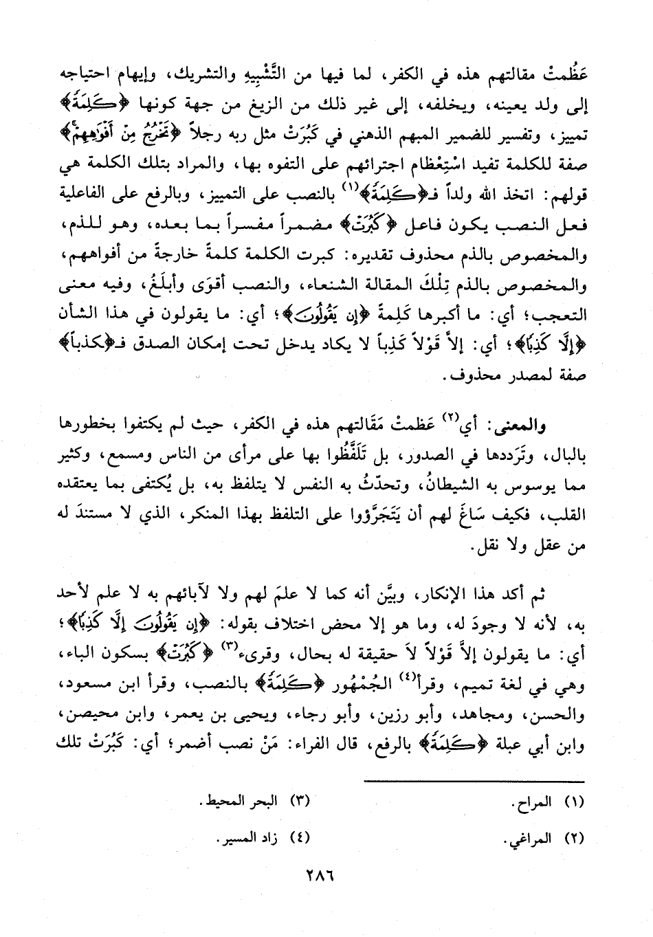 ثم أكد هذا الإنكار، وبيّن أنه كما لا علم لهم ولا لآبائهم به لا علم لأحد به، لأنه لا وجود له، وما هو إلا محض اختلاف بقوله: {إِنْ يَقُولُونَ إِلَّا كَذِبًا}؛ أي: ما يقولون إلّا قولًا لا حقيقة له بحال، وقرىء (¬3) {كبرت} بسكون الباء، وهي في لغة تميم، وقرأ (¬4) الجمهور {كَلِمَةً} بالنصب، وقرأ ابن مسعود، والحسن، ومجاهد، وأبو رزين، وأبو رجاء، ويحيى بن يعمر، وابن محيصن، وابن أبي عبلة {كلمة} بالرفع، قال الفراء: من نصب أضمر؛ أي: كبرت تلك