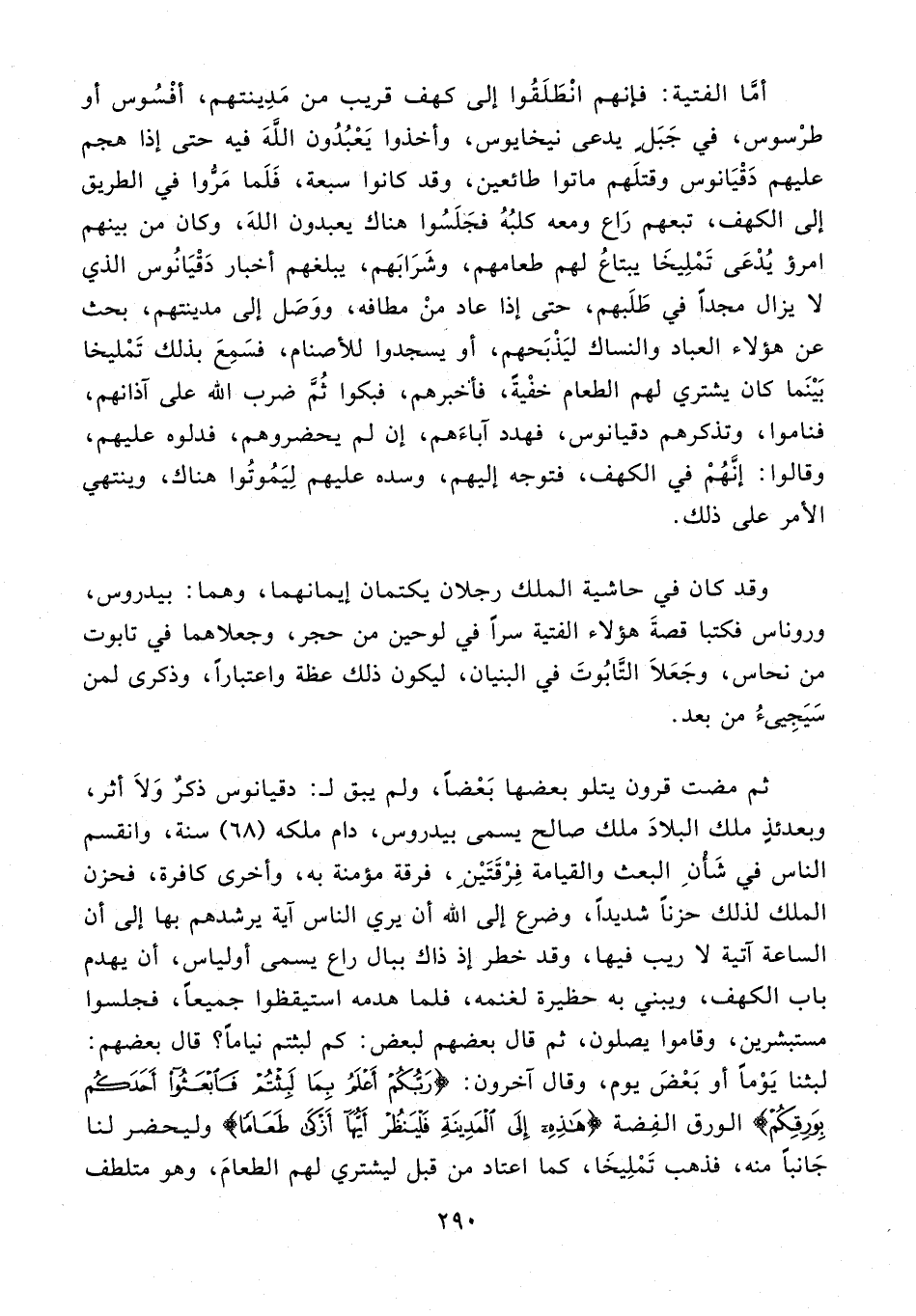ثم مضت قرون يتلو بعضها بعضًا، ولم يبق لـ: دقيانوس ذكرٌ ولا أثر، وبعدئذٍ ملك البلاد ملك صالح يسمى بيدروس، دام ملكه (68) سنة، وانقسم الناس في شأن البعث والقيامة فرقتين، فرقة مؤمنة به، وأخرى كافرة، فحزن الملك لذلك حزنًا شديدًا، وضرع إلى الله أن يري الناس آية يرشدهم بها إلى أن الساعة آتية لا ريب فيها، وقد خطر إذ ذاك ببال راع يسمى أولياس، أن يهدم باب الكهف، ويبني به حظيرة لغنمه، فلما هدمه استيقظوا جميعًا، فجلسوا مستبشرين، وقاموا يصلون، ثم قال بعضهم لبعض: كم لبثتم نيامًا؟ قال بعضهم: لبثنا يومًا أو بعض يوم، وقال آخرون: {رَبُّكُمْ أَعْلَمُ بِما لَبِثْتُمْ فَابْعَثُوا أَحَدَكُمْ بِوَرِقِكُمْ} الورق الفضة {هذِهِ إِلَى الْمَدِينَةِ فَلْيَنْظُرْ أَيُّها أَزْكى طَعامًا} وليحضر لنا جانبًا منه، فذهب تمليخا، كما اعتاد من قبل ليشتري لهم الطعام، وهو متلطف