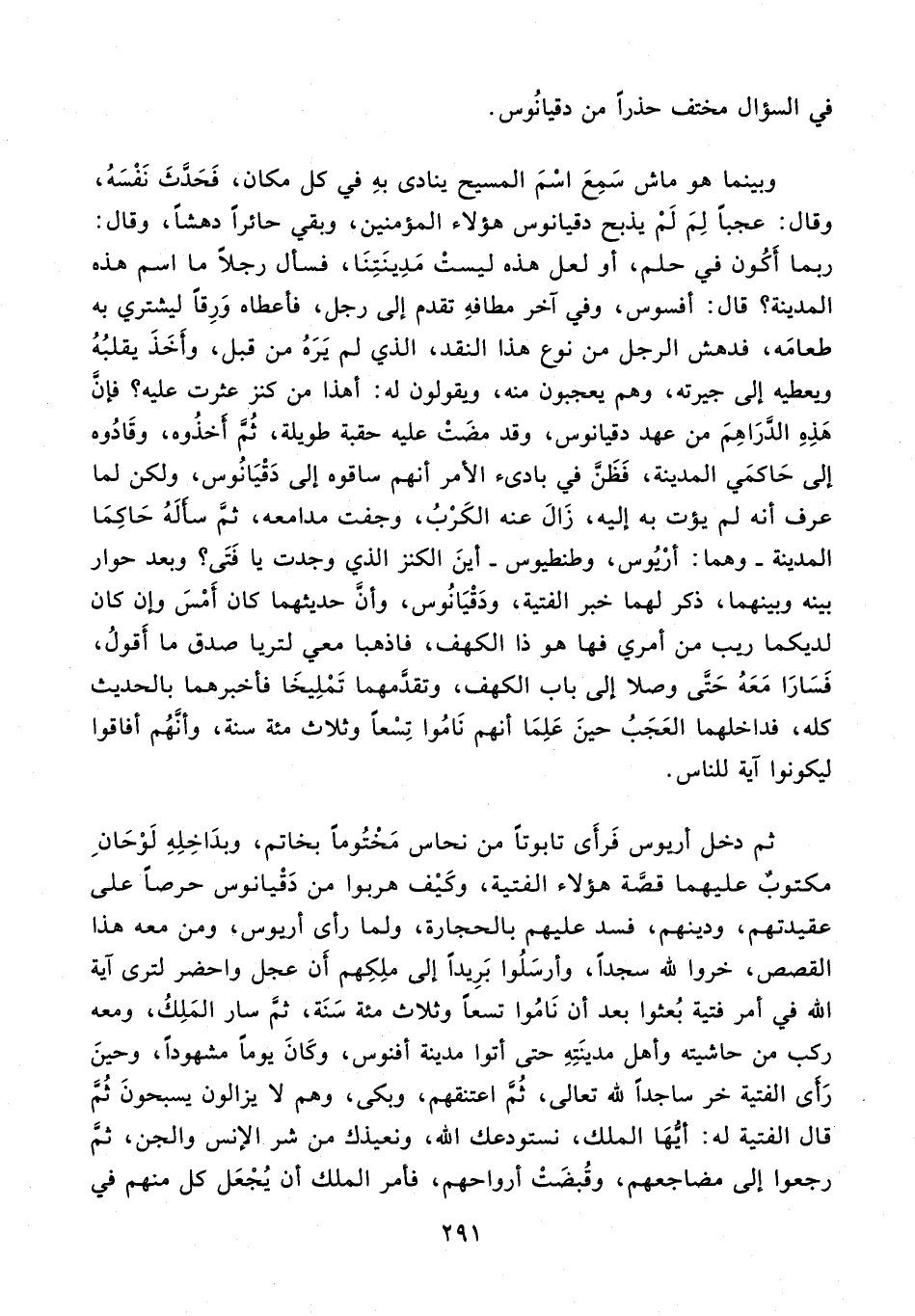 وبينما هو ماش سمع اسم المسيح ينادى به في كل مكان، فحدّث نفسه، وقال: عجبا لم لم يذبح دقيانوس هؤلاء المؤمنين، وبقي حائرًا دهشًا، وقال: ربما أكون في حلم، أو لعل هذه ليست مدينتنا، فسأل رجلًا ما اسم هذه المدينة؟ قال: أفسوس، وفي آخر مطافه تقدم إلى رجل، فأعطاه ورقًا ليشتري به طعامه، فدهش الرجل من نوع هذا النقد، الذي لم يره من قبل، وأخذ يقلبه ويعطيه إلى جبرته، وهم يعجبون منه، ويقولون له: أهذا من كنز عثرت عليه؟ فإنّ هذه الدّراهم من عهد دقيانوس، وقد مضت عليه حقبة طويلة، ثمّ أخذوه، وقادوه إلى حاكمي المدينة، فظنّ في بادىء الأمر أنهم ساقوه إلى دقيانوس، ولكن لما عرف أنه لم يؤت به إليه، زال عنه الكرب، وجفت مدامعه، ثمّ سأله حاكما المدينة - وهما: أريوس، وطنطيوس - أين الكنز الذي وجدت يا فتى؟ وبعد حوار بينه وبينهما، ذكر لهما خبر الفتية، ودقيانوس، وأنّ حديثهما كان أمس وإن كان لديكما ريب من أمري فها هو ذا الكهف، فاذهبا معي لتريا صدق ما أقول، فسارا معه حتّى وصلا إلى باب الكهف، وتقدّمهما تمليخا فأخبرهما بالحديث كله، فداخلهما العجب حين علما أنهم ناموا تسعا وثلاث مئة سنة، وأنّهم أفاقوا ليكونوا آية للناس.