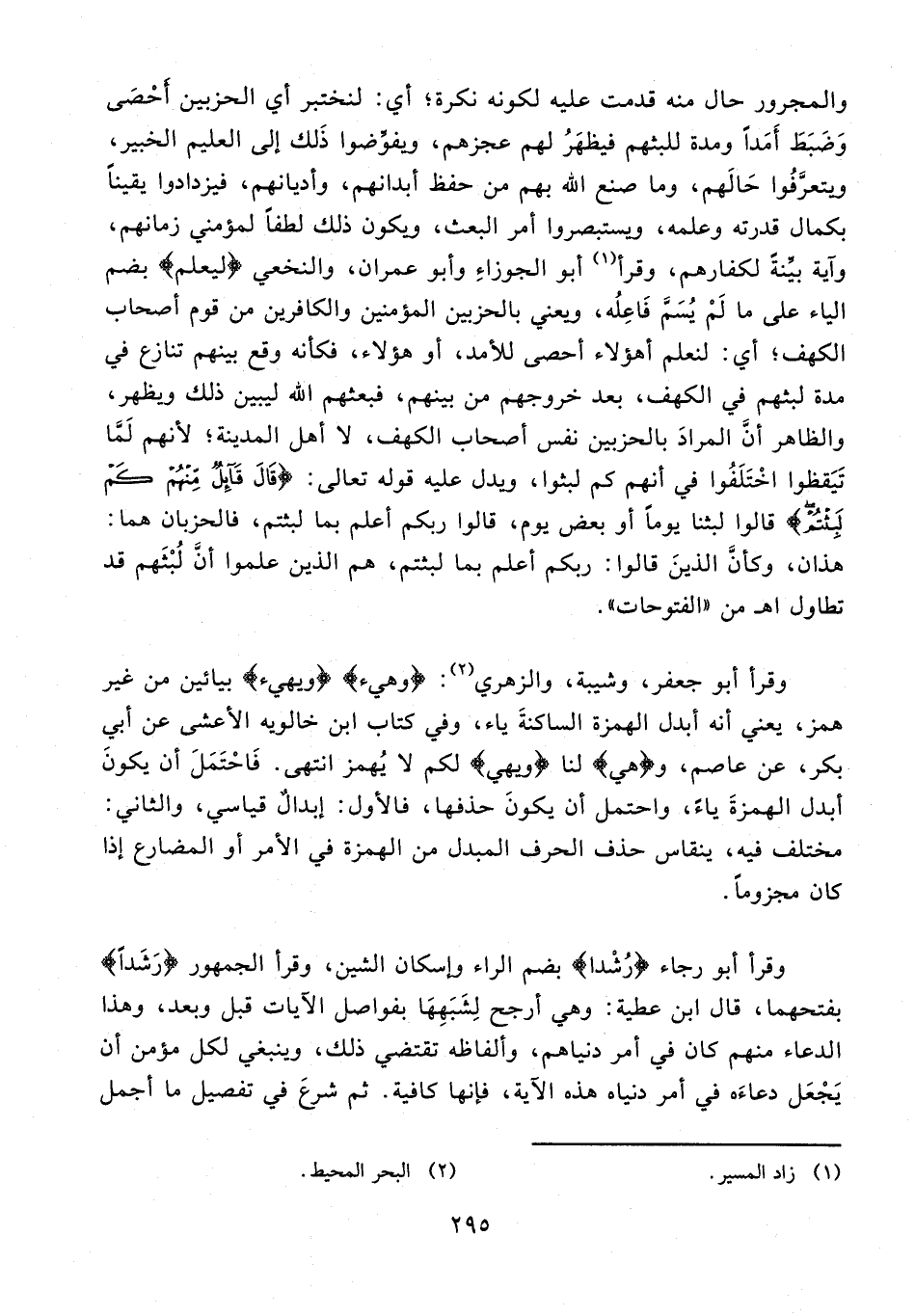 وقرأ أبو رجاء {رُشْدا} بضم الراء وإسكان الشين، وقرأ الجمهور {رَشَدًا} بفتحهما، قال ابن عطية: وهي أرجح لشبهها بفواصل الآيات قبل وبعد، وهذا الدعاء منهم كان في أمر دنياهم، وألفاظه تقتضي ذلك، وينبغي لكل مؤمن أن يجعل دعاءه في أمر دنياه هذه الآية، فإنها كافية.