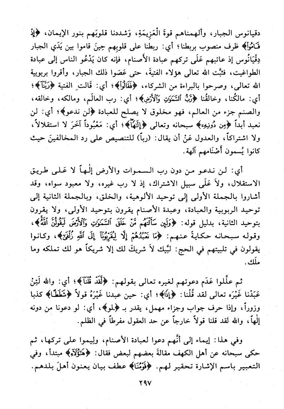 دقيانوس الجبار، وألهمناهم قوة العزيمة، وشددنا قلوبهم بنور الإيمان، {إِذْ قامُوا} ظرف منصوب بربطنا؛ أي: ربطنا على قلوبهم حين قاموا بين يدي الجبار دقيانوس إذ عاتبهم على تركهم عبادة الأصنام، فإنه كان يدعو الناس إلى عبادة الطواغيت، فثبّت الله تعالى هؤلاء الفتية، حتى عصوا ذلك الجبار، وأقروا بربوبية الله تعالى، وصرحوا بالبراءة من الشركاء، {فَقالُوا}؛ أي: قالت الفتية {رَبُّنا}؛ أي: مالكنا، وخالقنا {رَبُّ السَّماواتِ وَالْأَرْضِ}؛ أي: رب العالم، ومالكه، وخالقه، والصنم جزء من العالم، فهو مخلوق لا يصلح للعبادة {لَنْ نَدْعُوَا}؛ أي: لن نعبد أبدًا {مِنْ دُونِهِ} سبحانه وتعالى {إِلهًا}؛ أي: معبودًا آخر لا استقلالًا، ولا اشتراكًا، والعدول عن أن يقال: (ربًا) للتنصيص على رد المخالفين حيث كانوا يسمون أصنامهم آلهة.