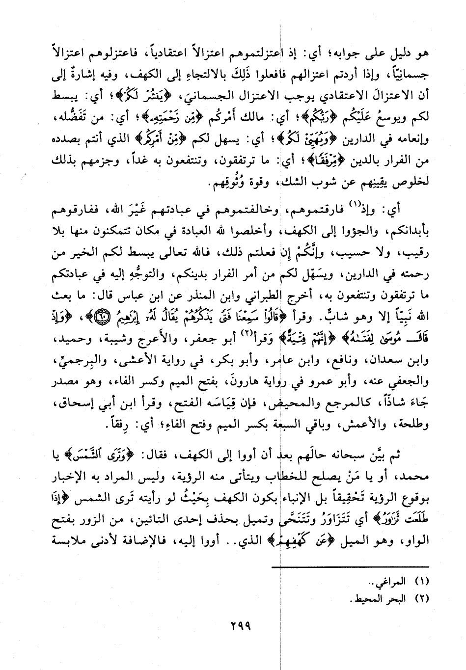 17 - ثم بيّن سبحانه حالهم بعد أن أووا إلى الكهف، فقال: {وَتَرَى الشَّمْسَ} يا محمد، أو يا من يصلح للخطاب ويتأتى منه الرؤية، وليس المراد به الإخبار بوقوع الرؤية تحقيقًا بل الإنباء بكون الكهف بحيث لو رأيته ترى الشمس {إِذا طَلَعَتْ تَزاوَرُ} أي تتزاور وتتنحّى وتميل بحذف إحدى التائين، من الزور بفتح الواو، وهو الميل {عَنْ كَهْفِهِمْ} الذي .. أووا إليه، فالإضافة لأدنى ملابسة