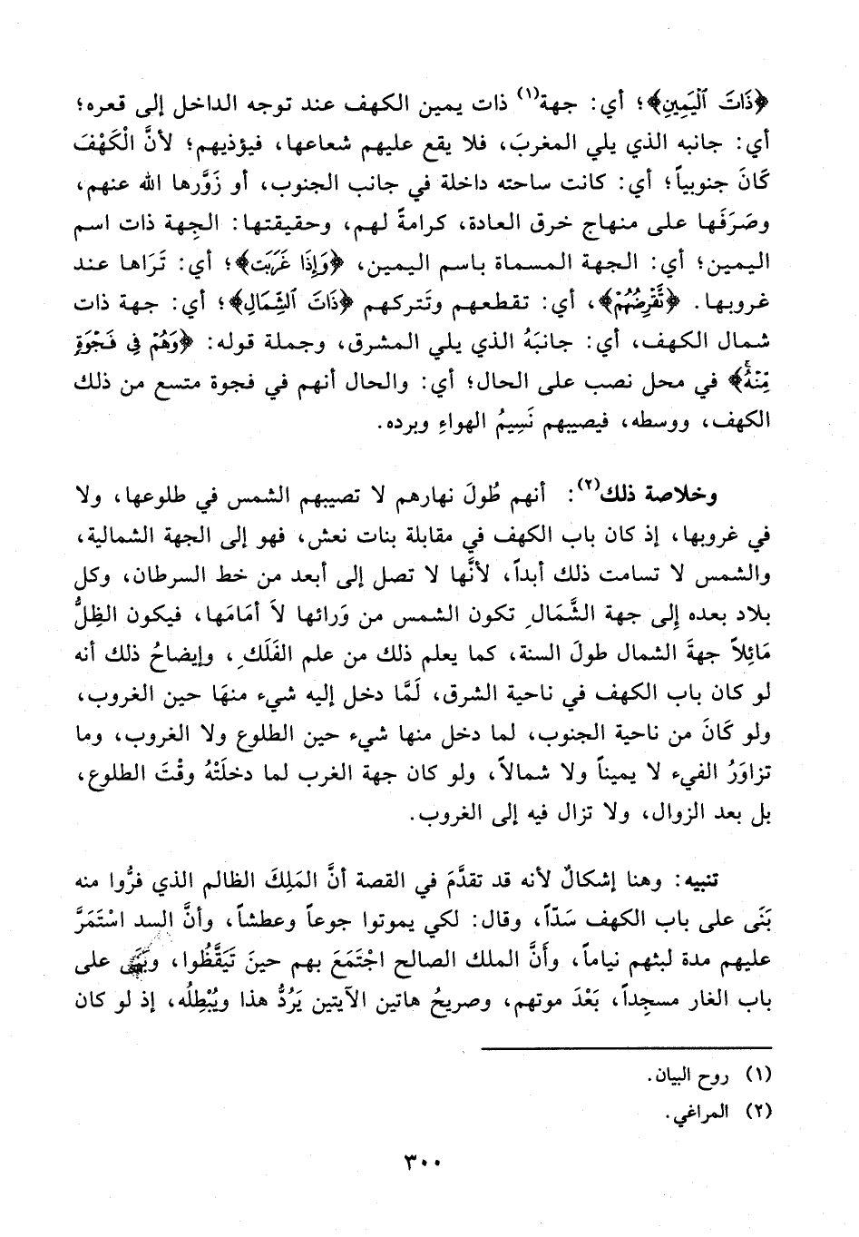 وخلاصة ذلك (¬2): أنهم طول نهارهم لا تصيبهم الشمس في طلوعها، ولا في غروبها، إذ كان باب الكهف في مقابلة بنات نعش، فهو إلى الجهة الشمالية، والشمس لا تسامت ذلك أبدًا، لأنّها لا تصل إلى أبعد من خط السرطان، وكل بلاد بعده إلى جهة الشّمال تكون الشمس من ورائها لا أمامها، فيكون الظلّ مائلًا جهة الشمال طول السنة، كما يعلم ذلك من علم الفلك، وإيضاح ذلك أنه لو كان باب الكهف في ناحية الشرق، لمّا دخل إليه شيء منها حين الغروب، ولو كان من ناحية الجنوب، لما دخل منها شيء حين الطلوع ولا الغروب، وما تزاور الفيء لا يمينًا ولا شمالًا، ولو كان جهة الغرب لما دخلته وقت الطلوع، بل بعد الزوال، ولا تزال فيه إلى الغروب.
