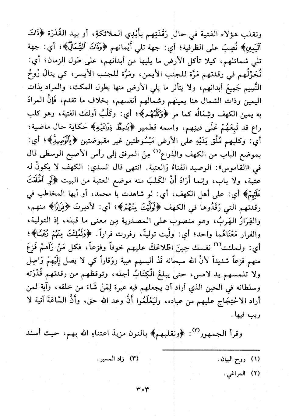 ونقلب هؤلاء الفتية في حال رقدتهم بأيدي الملائكة، أو بيد القدرة {ذاتَ الْيَمِينِ} نصب على الظرفية؛ أي: جهة تلي أيمانهم {وَذاتَ الشِّمالِ}؛ أي: جهة تلي شمائلهم، كيلا تأكل الأرض ما يليها من أبدانهم، على طول الزمان؛ أي: نحوّلهم في رقدتهم مرّة للجنب الأيمن، ومرّة للجنب الأيسر، كي ينال روح النّسيم جميع أبدانهم، ولا يتأثر ما يلي الأرض منها بطول المكث، والمراد بذات اليمين وذات الشمال هنا يمينهم وشمالهم أنفسهم، بخلاف ما تقدم، فإنّ المراد به يمين الكهف وشماله كما مر {وَكَلْبُهُمْ}؛ أي: وكلب أولئك الفتية، وهو كلب راع قد تبعهم على دينهم، واسمه قطمير {باسِطٌ ذِراعَيْهِ} حكاية حال ماضية؛ أي: وكلبهم ملق يديه على الأرض مبسوطتين غير مقبوضتين {بِالْوَصِيدِ}؛ أي: بموضع الباب من الكهف والذراع (¬1) من المرفق إلى رأس الأصبع الوسطى قال في «القاموس»: الوصيد الفناء والعتبة. انتهى قال السدي: الكهف لا يكون له عتبة، ولا باب، وإنما أراد أنّ الكلب منه موضع العتبة من البيت {لَوِ اطَّلَعْتَ عَلَيْهِمْ} أي: على أهل الكهف، أي: لو شاهدت يا محمد، أو أيها المخاطب في رقدتهم التي رقدوها في الكهف {لَوَلَّيْتَ مِنْهُمْ}؛ أي: لأدبرت {فِرارًا} منهم، والفرار الهرب، وهو منصوب على المصدرية من معنى ما قبله، إذ التولية، والفرار معناهما واحد؛ أي: ولّيت توليةً، وفررت فرارًا. {وَلَمُلِئْتَ مِنْهُمْ رُعْبًا}؛ أي: ولملئت (¬2) نفسك حين اطّلاعك عليهم خوفًا وفزعًا، فكل من رآهم فزع منهم فزعًا شديدًا لأنّ الله سبحانه قد ألبسهم هيبة ووقارًا كي لا يصل إليهم واصل ولا تلمسهم يد لامس، حتى يبلغ الكتاب أجله، وتوقظهم من رقدتهم قدرته وسلطانه في الحين الذي أراد أن يجعلهم فيه عبرة لمن شاء من خلقه، وآية لمن أراد الاحتجاج عليهم من عباده، وليعلموا أنّ وعد الله حق، وأنّ السّاعة آتية لا ريب فيها.