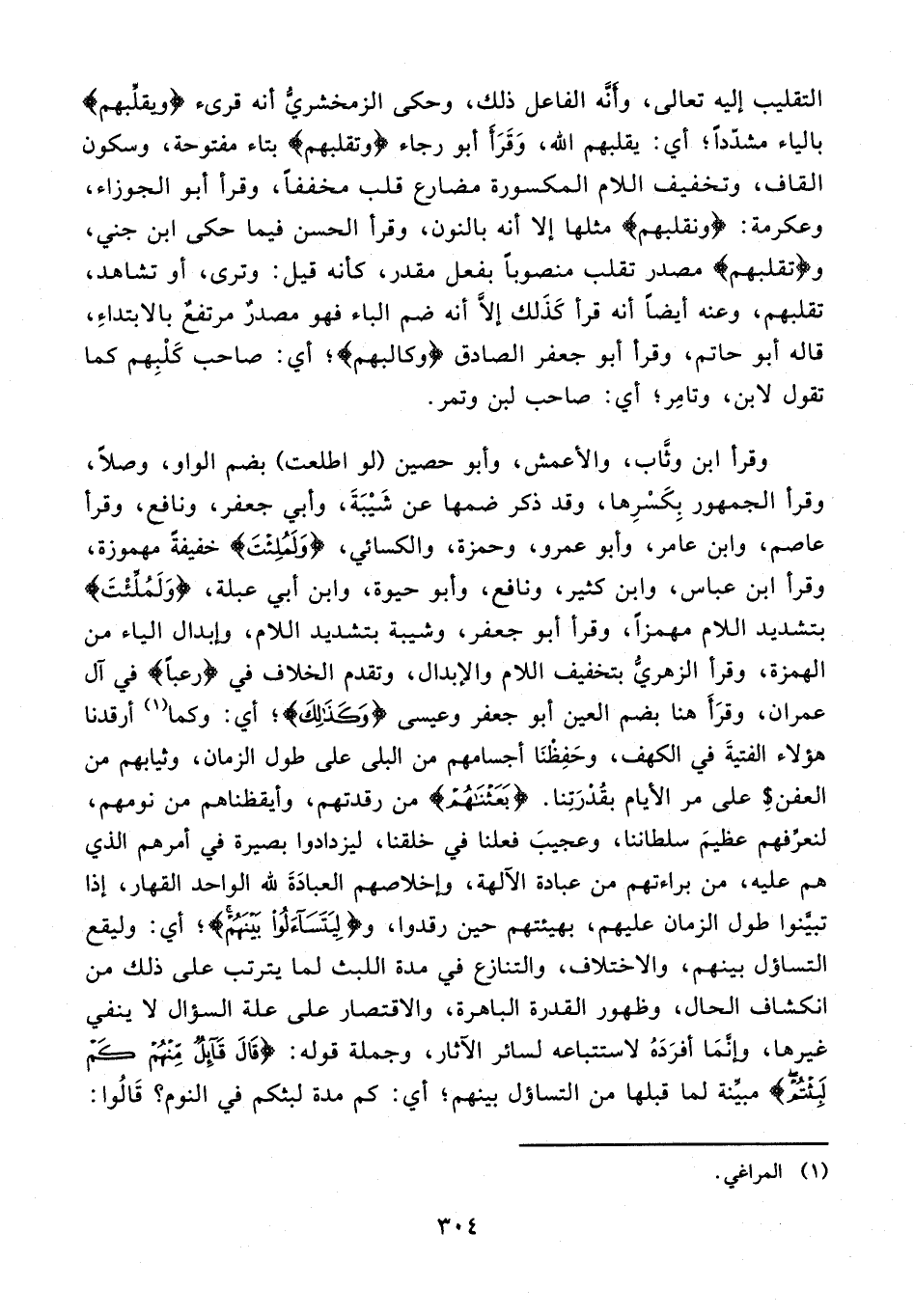 التقليب إليه تعالى، وأنّه الفاعل ذلك، وحكى الزمخشريّ أنه قرىء {ويقلِّبهم} بالياء مشدّدًا؛ أي: يقلبهم الله، وقرأ أبو رجاء {وتقلبهم} بتاء مفتوحة، وسكون القاف، وتخفيف اللام المكسورة مضارع قلب مخففًا، وقرأ أبو الجوزاء، وعكرمة: {ونقلبهم} مثلها إلا أنه بالنون، وقرأ الحسن فيما حكى ابن جني، و {تقلبهم} مصدر تقلب منصوبًا بفعل مقدر، كأنه قيل: وترى، أو تشاهد، تقلبهم، وعنه أيضًا أنه قرأ كذلك إلّا أنه ضم الباء فهو مصدرٌ مرتفعٌ بالابتداء، قاله أبو حاتم، وقرأ أبو جعفر الصادق {وكالبهم}؛ أي: صاحب كلبهم كما تقول لابن، وتامر؛ أي: صاحب لبن وتمر.