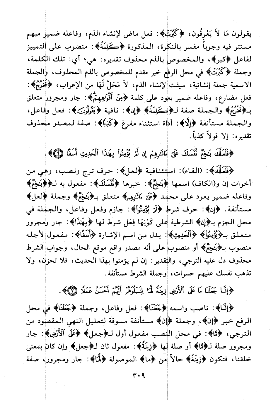 {فَلَعَلَّكَ}: {الفاء}: استئنافية {لعل}: حرف ترج ونصب، وهي من أخوات إن و {الكاف} اسمها {باخِعٌ}: خبرها {نَفْسَكَ}: مفعول به لـ {باخِعٌ} وفاعله ضمير يعود على محمد {عَلى آثارِهِمْ} متعلق بـ {باخِعٌ} وجملة {لعل} مستأنفة. {إِنْ}: حرف شرط {لَمْ يُؤْمِنُوا}: جازم وفعل وفاعل، والجملة في محل الجزم بـ {إِنْ} الشرطية على كونها فعل شرط لها {بِهذَا}: جار ومجرور متعلق بـ {يُؤْمِنُوا} {الْحَدِيثِ}: بدل من اسم الإشارة {أَسَفًا}: مفعول لأجله منصوب بـ {باخِعٌ} أو منصوب على أنه مصدر واقع موقع الحال، وجواب الشرط محذوف دل عليه الترجي، والتقدير: إن لم يؤمنوا بهذا الحديث، فلا تحزن، ولا تذهب نفسك عليهم حسرات، وجملة الشرط مستأنفة.