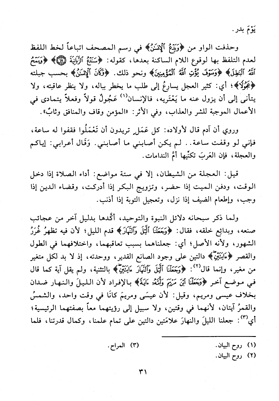 وحذفت الواو من {وَيَدْعُ الْإِنْسانُ} في رسم المصحف اتباعًا لخط اللفظ لعدم التلفظ بها لوقوع اللام الساكنة بعدها، كقوله: {سَنَدْعُ الزَّبانِيَةَ (18)} {وَيَمْحُ اللَّهُ الْباطِلَ وَسَوْفَ يُؤْتِ اللَّهُ الْمُؤْمِنِينَ} ونحو ذلك. {وَكانَ الْإِنْسانُ} بحسب جبلته {عَجُولًا}؛ أي: كثير العجل يسارع إلى طلب ما يخطر بباله، ولا ينظر عاقبته، ولا يتأنى إلى أن يزول عنه ما يعتريه، فالإنسان (¬1) عجولٌ قولًا وفعلًا يتمادى في الأعمال الموجبة للشر والعذاب، وفي الأثر: «المؤمن وقاف والمنافق وثاب».