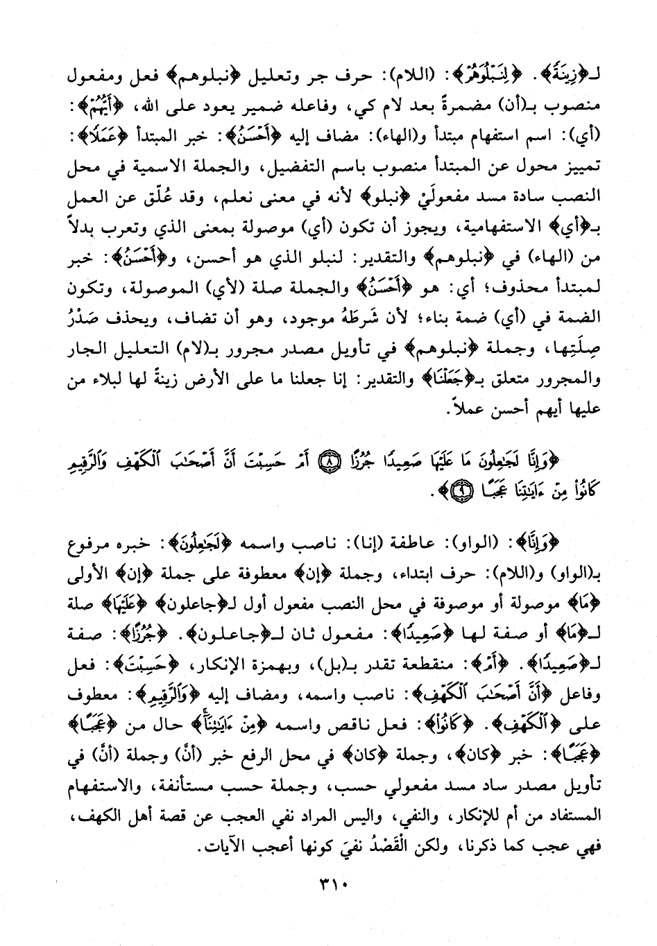 {وَإِنَّا}: {الواو}: عاطفة {إِنَّا}: ناصب واسمه {لَجاعِلُونَ}: خبره مرفوع بـ {الواو} و {اللام}: حرف ابتداء، وجملة {إن} معطوفة على جملة {إن} الأولى ما موصولة أو موصوفة في محل النصب مفعول أول لـ {جاعلون} {عَلَيْها} صلة لـ {ما} أو صفة لها {صَعِيدًا}: مفعول ثان لـ {جاعلون}. {جُرُزًا}: صفة لـ {صَعِيدًا}. {أَمْ}: منقطعة تقدر بـ {بل}، وبهمزة الإنكار، {حَسِبْتَ}: فعل وفاعل {أَنَّ أَصْحابَ الْكَهْفِ}: ناصب واسمه، ومضاف إليه {وَالرَّقِيمِ}: معطوف على {الْكَهْفِ}. {كانُوا}: فعل ناقص واسمه {مِنْ آياتِنا} حال من {عَجَبًا} {عَجَبًا}: خبر {كان}، وجملة {كان} في محل الرفع خبر {أنّ} وجملة {أنّ} في تأويل مصدر ساد مسد مفعولي حسب، وجملة حسب مستأنفة، والاستفهام المستفاد من أم للإنكار، والنفي، واليس المراد نفي العجب عن قصة أهل الكهف، فهي عجب كما ذكرنا، ولكن القصد نفي كونها أعجب الآيات.