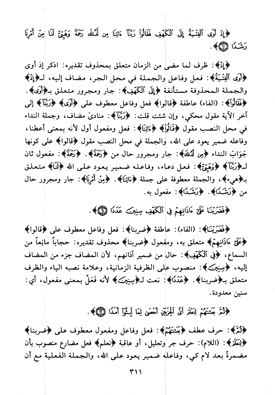 {إِذْ}: ظرف لما مضى من الزمان متعلق بمحذوف تقديره: اذكر إذ أوى {أَوَى الْفِتْيَةُ}: فعل وفاعل والجملة في محل الجر، مضاف إليه، لـ {إِذْ} والجملة المحذوفة مستأنفة {إِلَى الْكَهْفِ}: جار ومجرور متعلق بـ {أَوَى}. {فَقالُوا}: {الفاء} عاطفة {قالوا} فعل وفاعل معطوف على {أَوَى} {رَبَّنا} إلى آخر الآية مقول محكي، وإن شئت قلت: {رَبَّنا}: منادى مضاف، وجملة النداء في محل النصب مقول {قالوا} {آتِنا}: فعل ومفعول أول لأنه بمعنى أعطنا، وفاعله ضمير يعود على الله، والجملة في محل النصب مقول {قالوا} على كونها جواب النداء {مِنْ لَدُنْكَ}: جار ومجرور حال من {رَحْمَةً}. {رَحْمَةً}: مفعول ثان لـ {رَبَّنا} {وَهَيِّئْ}: فعل دعاء، وفاعله ضمير يعود على الله {لَنا} متعلق بـ {هَيِّئْ}، والجملة معطوفة على جملة {آتِنا}. {مِنْ أَمْرِنا}: جار ومجرور حال من {رَشَدًا}. {رَشَدًا}: مفعول به.