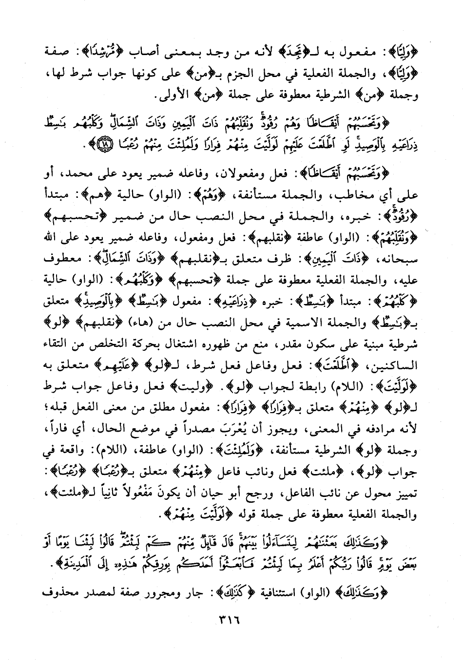 {وَتَحْسَبُهُمْ أَيْقاظًا}: فعل ومفعولان، وفاعله ضمير يعود على محمد، أو على أي مخاطب، والجملة مستأنفة، {وَهُمْ}: {الواو} حالية {هُمْ}: مبتدأ {رُقُودٌ}: خبره، والجملة في محل النصب حال من ضمير {تَحْسَبُهُمْ} {وَنُقَلِّبُهُمْ}: {الواو} عاطفة {نُقَلِّبُهُمْ}: فعل ومفعول، وفاعله ضمير يعود على الله سبحانه، {ذاتَ الْيَمِينِ}: ظرف متعلق بـ {نُقَلِّبُهُمْ} {وَذاتَ الشِّمالِ}: معطوف عليه، والجملة الفعلية معطوفة على جملة {تَحْسَبُهُمْ} {وَكَلْبُهُمْ}: {الواو} حالية {كَلْبُهُمْ}: مبتدأ {باسِطٌ}: خبره {ذِراعَيْهِ}: مفعول {باسِطٌ} {بِالْوَصِيدِ} متعلق بـ {باسِطٌ} والجملة الاسمية في محل النصب حال من (هاء) {نُقَلِّبُهُمْ} {لَوِ} شرطية مبنية على سكون مقدر، منع من ظهوره اشتغال بحركة التخلص من التقاء الساكنين، {اطَّلَعْتَ}: فعل وفاعل فعل شرط، لـ {لَوِ} {عَلَيْهِمْ} متعلق به {لَوَلَّيْتَ}: {اللام} رابطة لجواب {لَوِ}. {وليت} فعل وفاعل جواب شرط لـ {لَوِ} {مِنْهُمْ} متعلق بـ {فِرارًا} {فِرارًا}: مفعول مطلق من معنى الفعل قبله؛ لأنه مرادفه في المعنى، ويجوز أن يعرب مصدرًا في موضع الحال، أي فارًا، وجملة {لَوِ} الشرطية مستأنفة، {وَلَمُلِئْتَ}: {الواو} عاطفة، {اللام}: واقعة في جواب {لَوِ}، {ملئت} فعل ونائب فاعل {مِنْهُمْ} متعلق بـ {رُعْبًا} {رُعْبًا}: تمييز محول عن نائب الفاعل، ورجح أبو حيان أن يكون مفعولًا ثانيًا لـ {ملئت}، والجملة الفعلية معطوفة على جملة قوله {لَوَلَّيْتَ مِنْهُمْ}.