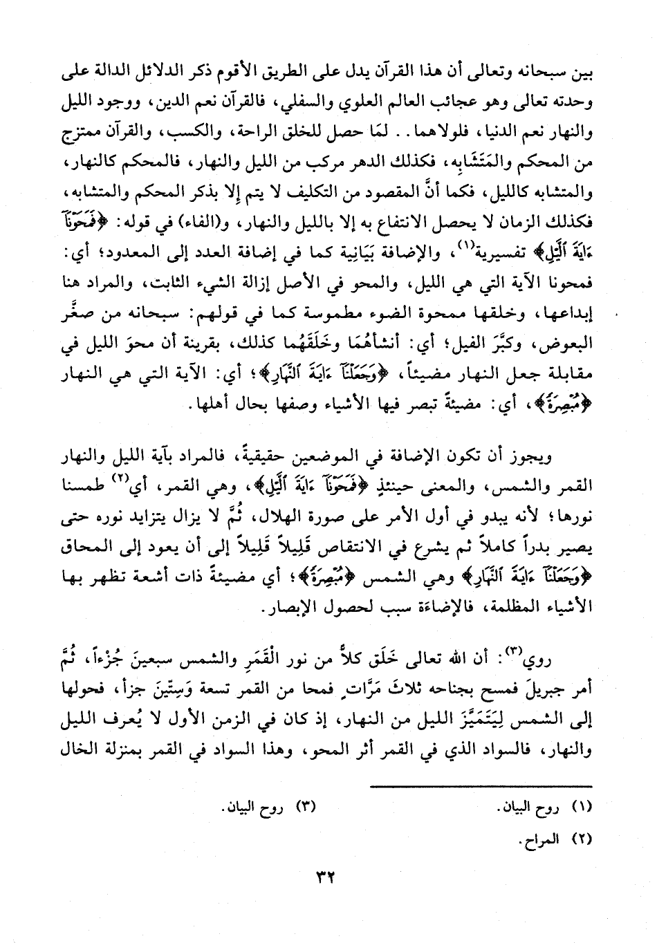 ويجوز أن تكون الإضافة في الموضعين حقيقية، فالمراد بآية الليل والنهار القمر والشمس، والمعنى حينئذ {فَمَحَوْنا آيَةَ اللَّيْلِ}، وهي القمر، أي (¬2) طمسنا نورها؛ لأنه يبدو في أول الأمر على صورة الهلال، ثمّ لا يزال يتزايد نوره حتى يصير بدرًا كاملًا ثم يشرع في الانتقاص قليلًا قليلًا إلى أن يعود إلى المحاق {وَجَعَلْنا آيَةَ النَّهارِ} وهي الشمس {مُبْصِرَةً}؛ أي مضيئة ذات أشعة تظهر بها الأشياء المظلمة، فالإضاءة سبب لحصول الإبصار.
