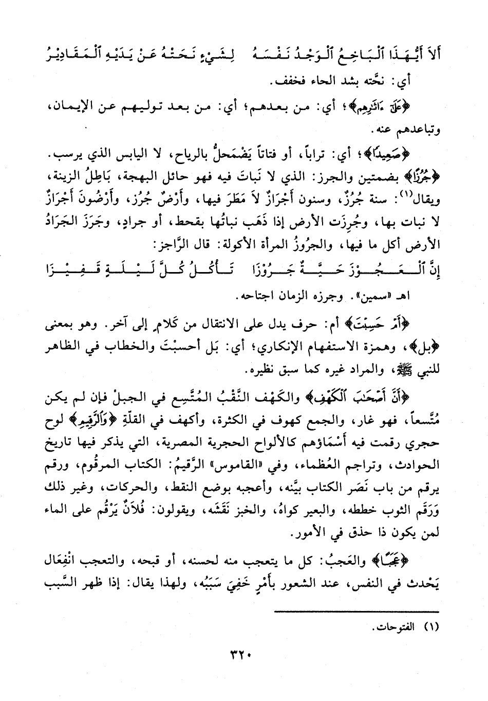 {صَعِيدًا}؛ أي: ترابًا، أو فتاتًا يضمحلُّ بالرياح، لا اليابس الذي يرسب. {جُرُزًا} بضمتين والجرز: الذي لا نبات فيه فهو حائل البهجة، باطل الزينة، ويقال (¬1): سنة جرزٌ، وسنون أجرازٌ لا مطر فيها، وأرضٌ جرز، وأرضون أجرازٌ لا نبات بها، وجرزت الأرض إذا ذهب نباتها بقحط، أو جراد، وجرز الجراد الأرض أكل ما فيها، والجروز المرأة الأكولة: قال الرّاجز: