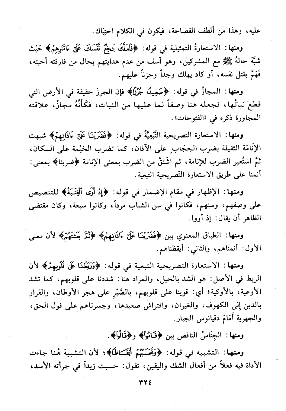 ومنها: الاستعارة التصريحية التّبعيّة في قوله: {فَضَرَبْنا عَلَى آذانِهِمْ} شبهت الإنامة الثقيلة بضرب الحجاب على الآذان، كما تضرب الخيمة على السكان، ثمّ استعير الضرب للإنامة، ثم اشتقّ من الضرب بمعنى الإنامة {ضربنا} بمعنى: أنمنا على طريق الاستعارة التّصريحية التبعية.