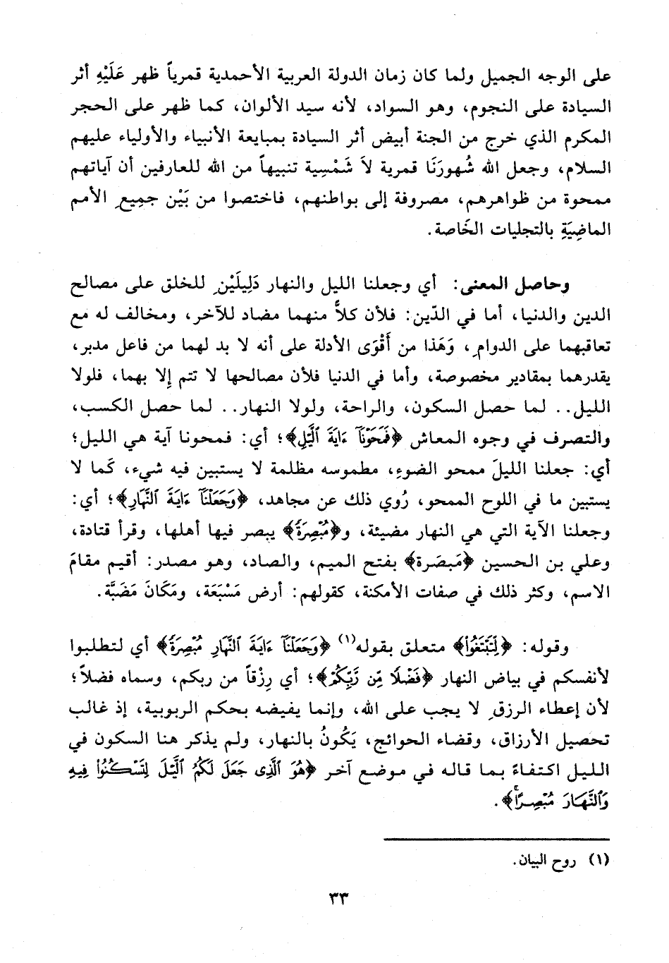 وحاصل المعنى: أي وجعلنا الليل والنهار دليلين للخلق على مصالح الدين والدنيا، أما في الدّين: فلأن كلّا منهما مضاد للآخر، ومخالف له مع تعاقبهما على الدوام، وهذا من أقوى الأدلة على أنه لا بد لهما من فاعل مدبر، يقدرهما بمقادير مخصوصة، وأما في الدنيا فلأن مصالحها لا تتم إلا بهما، فلولا الليل .. لما حصل السكون، والراحة، ولولا النهار .. لما حصل الكسب، والتصرف في وجوه المعاش {فَمَحَوْنا آيَةَ اللَّيْلِ}؛ أي: فمحونا آية هي الليل؛ أي: جعلنا الليل ممحو الضوء، مطموسه مظلمة لا يستبين فيه شيء، كما لا يستبين ما في اللوح الممحو، روي ذلك عن مجاهد، {وَجَعَلْنا آيَةَ النَّهارِ}؛ أي: وجعلنا الآية التي هي النهار مضيئة، و {مُبْصِرَةً} يبصر فيها أهلها، وقرأ قتادة، وعلي بن الحسين {مبصرة} بفتح الميم، والصاد، وهو مصدر: أقيم مقام الاسم، وكثر ذلك في صفات الأمكنة، كقولهم: أرض مسبعة، ومكان مضبّة.