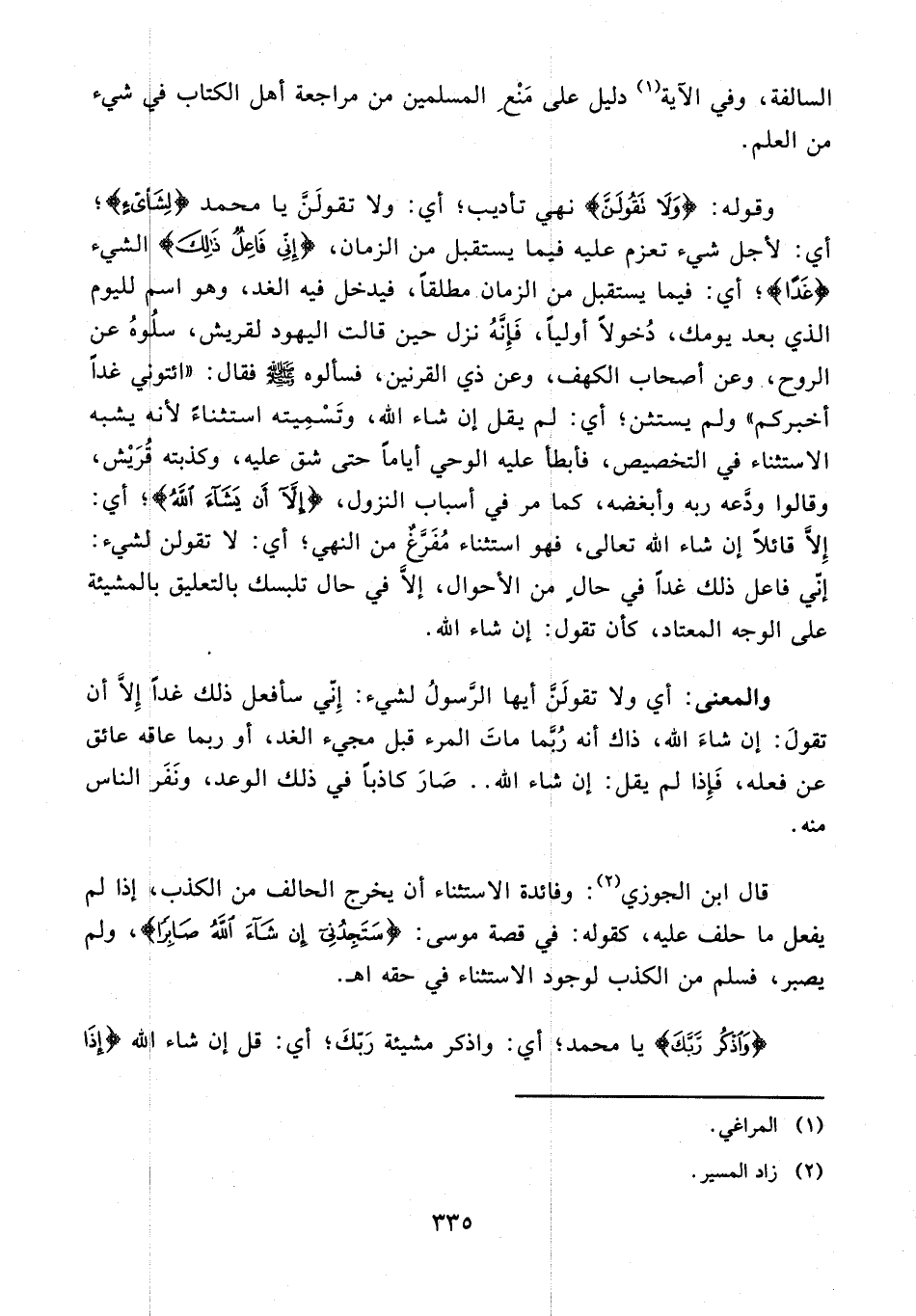 والمعنى: أي ولا تقولنّ أيها الرّسول لشيء: إنّي سأفعل ذلك غدًا إلّا أن تقول: إن شاء الله، ذاك أنه ربّما مات المرء قبل مجيء الغد، أو ربما عاقه عائق عن فعله، فإذا لم يقل: إن شاء الله .. صار كاذبًا في ذلك الوعد، ونفر الناس منه.