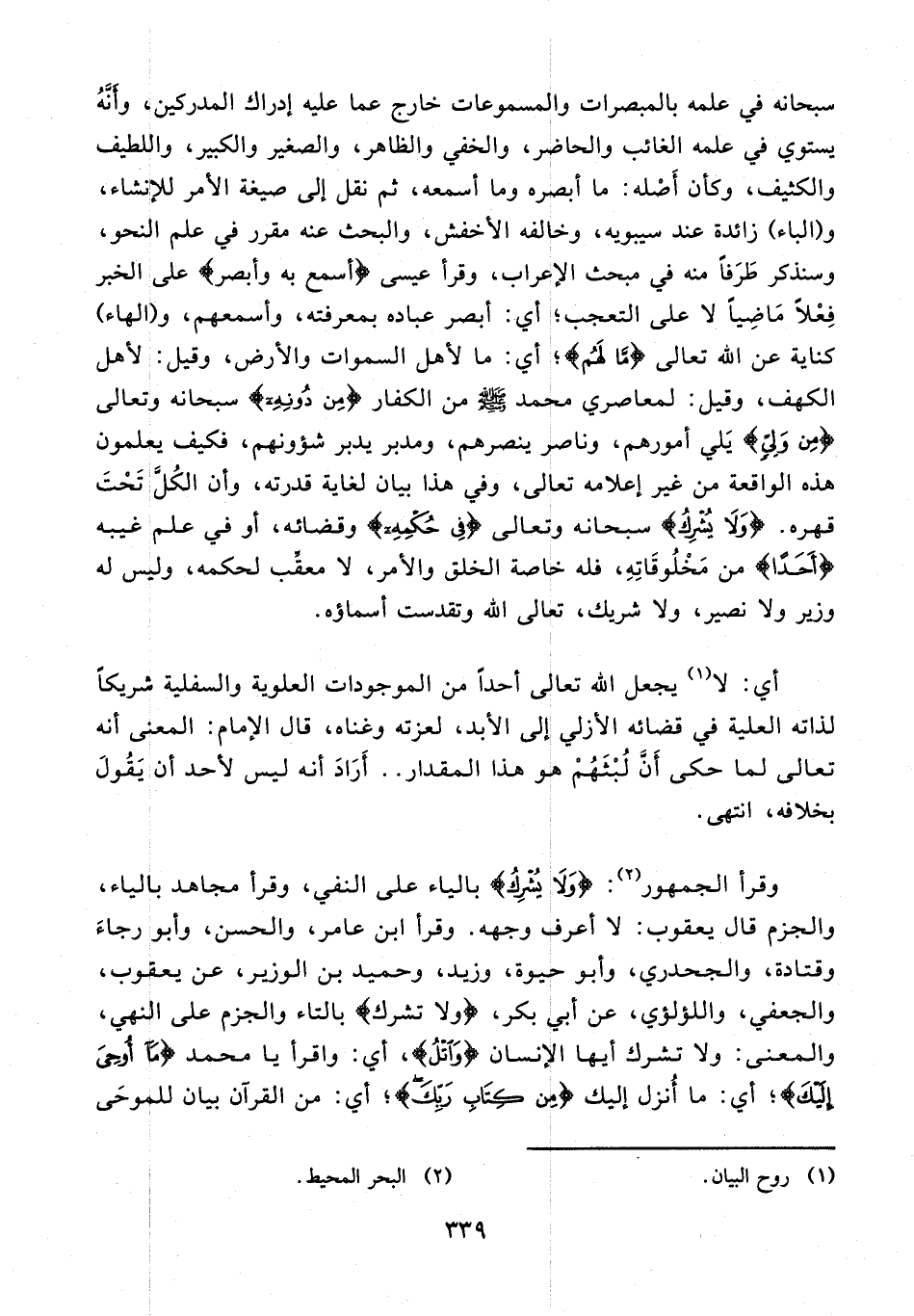 وقرأ الجمهور (¬2): {وَلا يُشْرِكُ} بالياء على النفي، وقرأ مجاهد بالياء، والجزم قال يعقوب: لا أعرف وجهه. وقرأ ابن عامر، والحسن، وأبو رجاء وقتادة، والجحدري، وأبو حيوة، وزيد، وحميد بن الوزير، عن يعقوب، والجعفي، واللؤلؤي، عن أبي بكر، {ولا تشرك} بالتاء والجزم على النهي، والمعنى: ولا تشرك أيها الإنسان