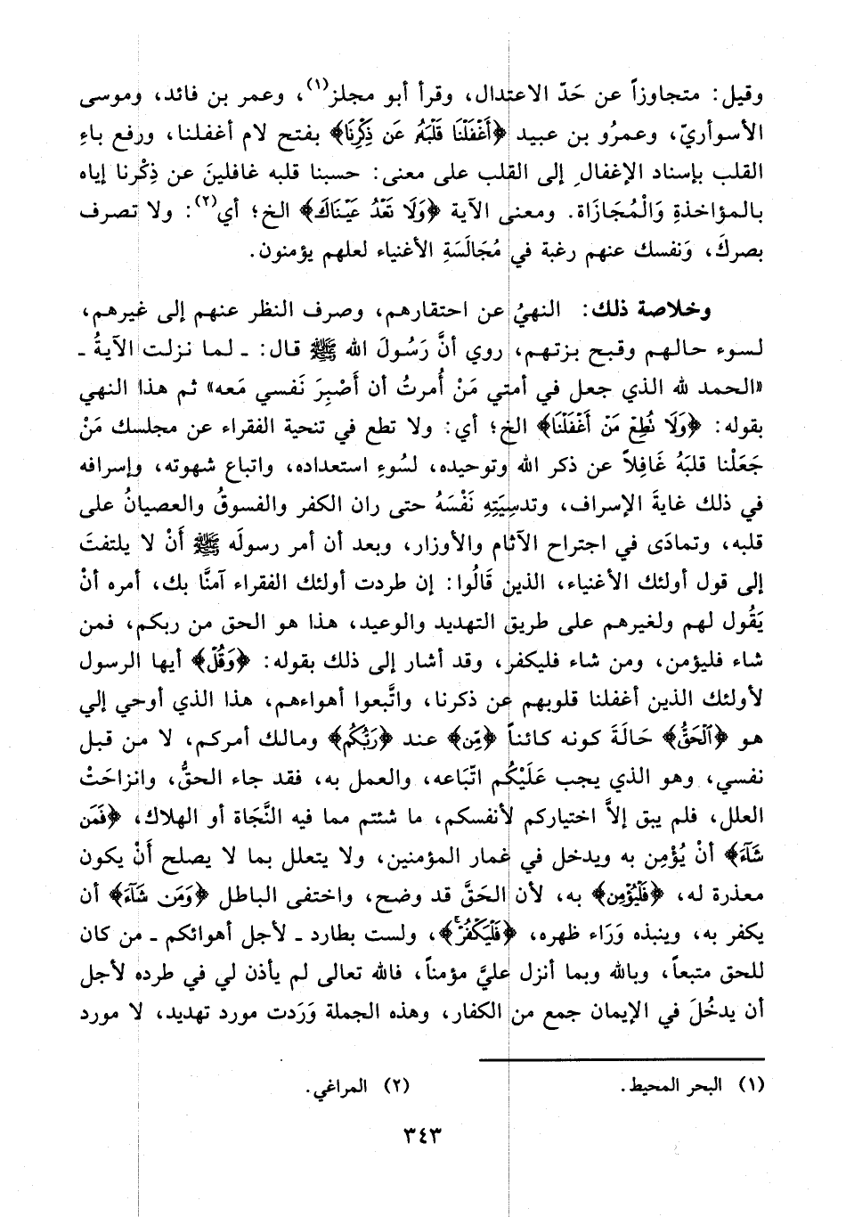وقيل: متجاوزًا عن حدّ الاعتدال، وقرأ أبو مجلز (¬1)، وعمر بن فائد، وموسى الأسوأريّ، وعمرو بن عبيد {أَغْفَلْنا قَلْبَهُ عَنْ ذِكْرِنا} بفتح لام أغفلنا، ورفع باء القلب بإسناد الإغفال إلى القلب على معنى: حسبنا قلبه غافلين عن ذكرنا إياه بالمؤاخذة والمجازاة. ومعنى الآية {وَلا تَعْدُ عَيْناكَ} الخ؛ أي (¬2): ولا تصرف بصرك، ونفسك عنهم رغبة في مجالسة الأغنياء لعلهم يؤمنون.