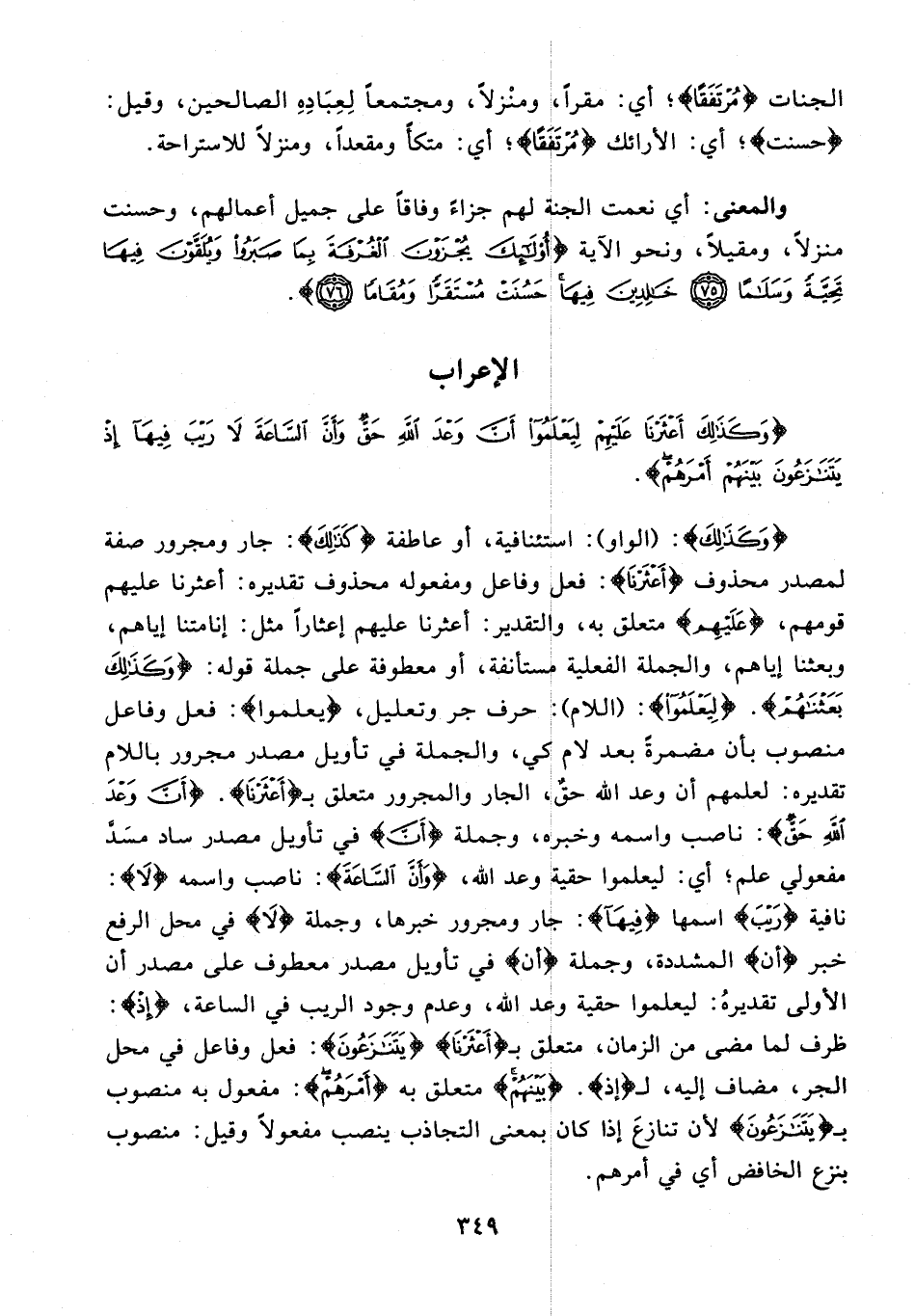 {وَكَذلِكَ}: {الواو}: استئنافية، أو عاطفة {كَذلِكَ}: جار ومجرور صفة لمصدر محذوف {أَعْثَرْنا}: فعل وفاعل ومفعوله محذوف تقديره: أعثرنا عليهم قومهم، {عَلَيْهِمْ} متعلق به، والتقدير: أعثرنا عليهم إعثارًا مثل: إنامتنا إياهم، وبعثنا إياهم، والجملة الفعلية مستأنفة، أو معطوفة على جملة قوله: {وَكَذلِكَ بَعَثْناهُمْ}. {لِيَعْلَمُوا}: {اللام}: حرف جر وتعليل، {يعلموا}: فعل وفاعل منصوب بأن مضمرة بعد لام كي، والجملة في تأويل مصدر مجرور باللام تقديره: لعلمهم أن وعد الله حق، الجار والمجرور متعلق بـ {أَعْثَرْنا}. {أَنَّ وَعْدَ اللَّهِ حَقٌّ}: ناصب واسمه وخبره، وجملة {أَنَّ} في تأويل مصدر ساد مسدّ مفعولي علم؛ أي: ليعلموا حقية وعد الله، {وَأَنَّ السَّاعَةَ}: ناصب واسمه {لا}: نافية {رَيْبَ} اسمها {فِيها}: جار ومجرور خبرها، وجملة {لا} في محل الرفع خبر {أَنَّ} المشددة، وجملة {أَنَّ} في تأويل مصدر معطوف على مصدر أن الأولى تقديره: ليعلموا حقية وعد الله، وعدم وجود الريب في الساعة، {إِذْ}: ظرف لما مضى من الزمان، متعلق بـ {أَعْثَرْنا} {يَتَنازَعُونَ}: فعل وفاعل في محل الجر، مضاف إليه، لـ {إِذْ}. {بَيْنَهُمْ} متعلق به {أَمْرَهُمْ}: مفعول به منصوب بـ {يَتَنازَعُونَ} لأن تنازع إذا كان بمعنى التجاذب ينصب مفعولًا وقيل: منصوب بنزع الخافض أي في أمرهم.