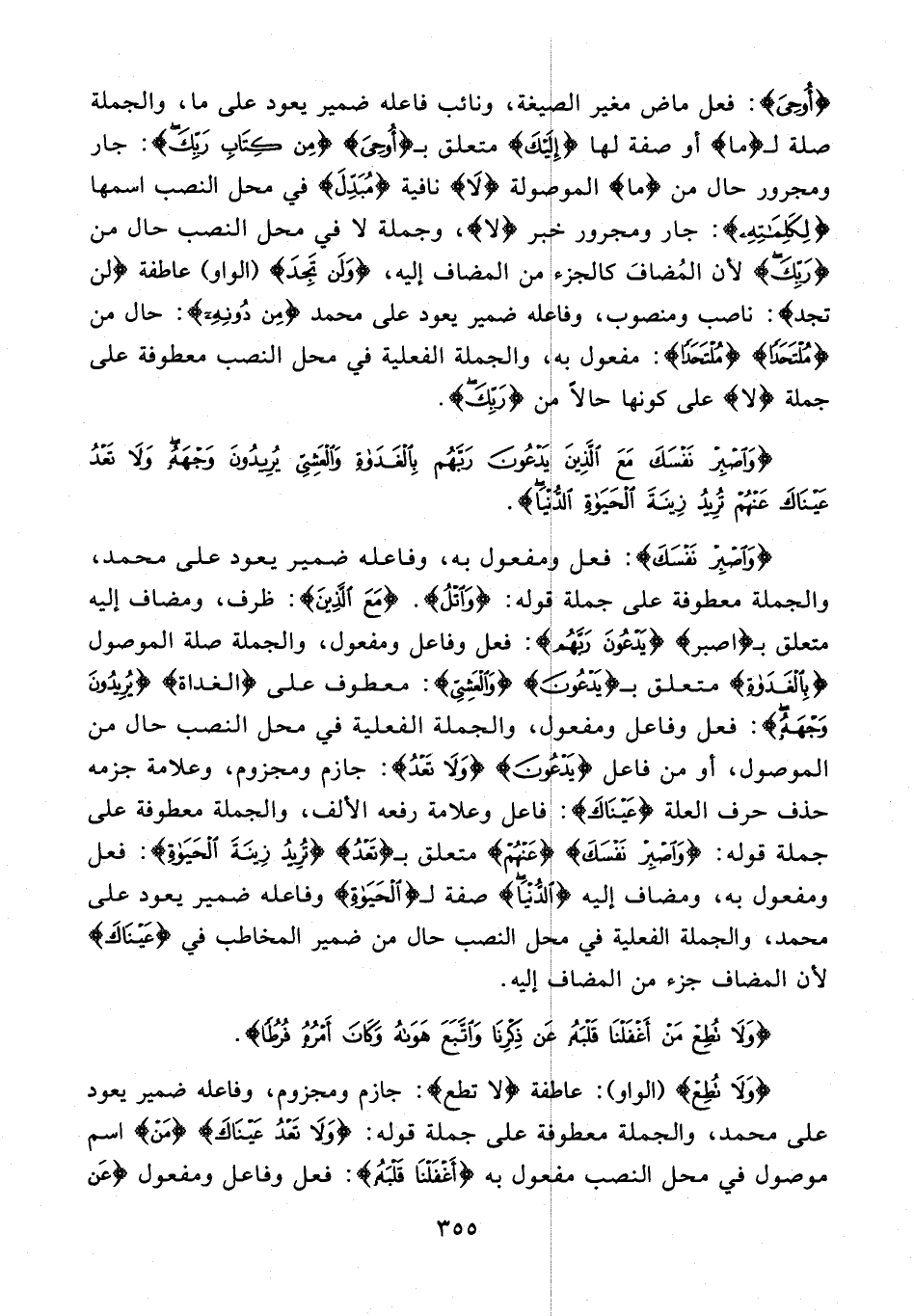 {وَاصْبِرْ نَفْسَكَ}: فعل ومفعول به، وفاعله ضمير يعود على محمد، والجملة معطوفة على جملة قوله: {وَاتْلُ}. {مَعَ الَّذِينَ}: ظرف، ومضاف إليه متعلق بـ {اصْبِرْ} {يَدْعُونَ رَبَّهُمْ}: فعل وفاعل ومفعول، والجملة صلة الموصول {بِالْغَداةِ} متعلق بـ {يَدْعُونَ} {وَالْعَشِيِّ}: معطوف على {الغداة} {يُرِيدُونَ وَجْهَهُ}: فعل وفاعل ومفعول، والجملة الفعلية في محل النصب حال من الموصول، أو من فاعل {يَدْعُونَ} {وَلا تَعْدُ}: جازم ومجزوم، وعلامة جزمه حذف حرف العلة {عَيْناكَ}: فاعل وعلامة رفعه الألف، والجملة معطوفة على جملة قوله: {وَاصْبِرْ نَفْسَكَ} {عَنْهُمْ} متعلق بـ {تَعْدُ} {تُرِيدُ زِينَةَ الْحَياةِ}: فعل ومفعول به، ومضاف إليه {الدُّنْيا} صفة لـ {الْحَياةِ} وفاعله ضمير يعود على محمد، والجملة الفعلية في محل النصب حال من ضمير المخاطب في {عَيْناكَ} لأن المضاف جزء من المضاف إليه.