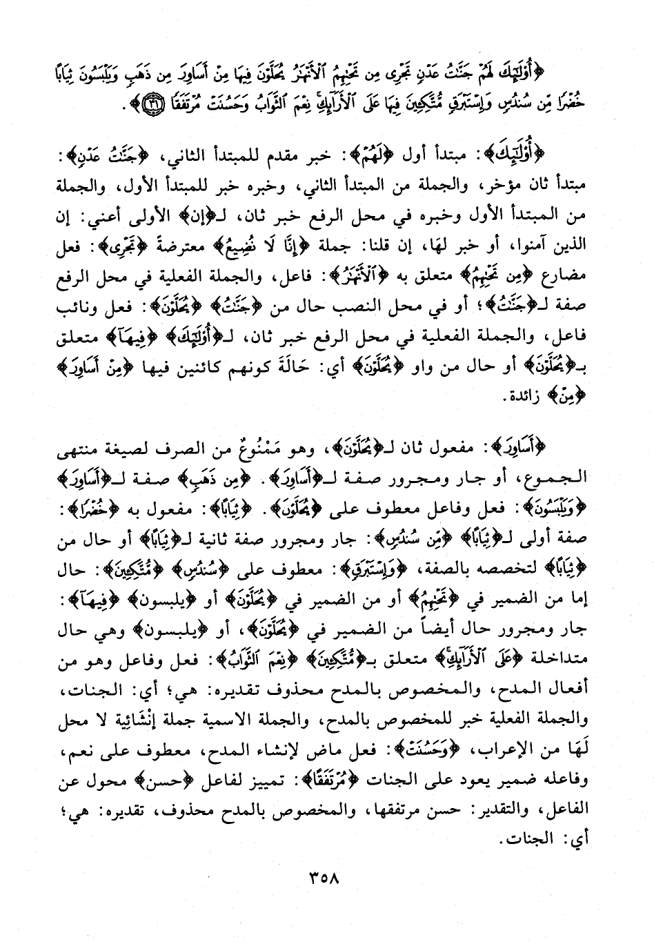 {أُولئِكَ}: مبتدأ أول {لَهُمْ}: خبر مقدم للمبتدأ الثاني، {جَنَّاتُ عَدْنٍ}: مبتدأ ثان مؤخر، والجملة من المبتدأ الثاني، وخبره خبر للمبتدأ الأول، والجملة من المبتدأ الأول وخبره في محل الرفع خبر ثان، لـ {إِنَّ} الأولى أعني: إِنَّ الَّذِينَ آمَنُوا، أو خبر لها، إن قلنا: جملة {إِنَّا لا نُضِيعُ} معترضة {تَجْرِي}: فعل مضارع {مِنْ تَحْتِهِمُ} متعلق به {الْأَنْهارُ}: فاعل، والجملة الفعلية في محل الرفع صفة لـ {جَنَّاتُ}؛ أو في محل النصب حال من {جَنَّاتُ} {يُحَلَّوْنَ}: فعل ونائب فاعل، والجملة الفعلية في محل الرفع خبر ثان، لـ {أُولئِكَ} فِيها متعلق بـ {يُحَلَّوْنَ} أو حال من واو {يُحَلَّوْنَ} أي: حالة كونهم كائنين فيها {مِنْ أَساوِرَ} {مِنْ} زائدة. {أَساوِرَ}: مفعول ثان لـ {يُحَلَّوْنَ}، وهو ممنوعٌ من الصرف لصيغة منتهى الجموع، أو جار ومجرور صفة لـ {أَساوِرَ}. {مِنْ ذَهَبٍ} صفة لـ {أَساوِرَ} {وَيَلْبَسُونَ}: فعل وفاعل معطوف على {يُحَلَّوْنَ}. {ثِيابًا}: مفعول به {خُضْرًا}: صفة أولى لـ {ثِيابًا} {مِنْ سُنْدُسٍ}: جار ومجرور صفة ثانية لـ {ثِيابًا} أو حال من {ثِيابًا} لتخصصه بالصفة، {وَإِسْتَبْرَقٍ}: معطوف على {سُنْدُسٍ} {مُتَّكِئِينَ}: حال إما من الضمير في {تَحْتِهِمُ} أو من الضمير في {يُحَلَّوْنَ} أو {يَلْبَسُونَ} {فِيها}: جار ومجرور حال أيضًا من الضمير في {يُحَلَّوْنَ}، أو {يَلْبَسُونَ} وهي حال متداخلة {عَلَى الْأَرائِكِ} متعلق بـ {مُتَّكِئِينَ} {نِعْمَ الثَّوابُ}: فعل وفاعل وهو من أفعال المدح، والمخصوص بالمدح محذوف تقديره: هي؛ أي: الجنات، والجملة الفعلية خبر للمخصوص بالمدح، والجملة الاسمية جملة إنشائية لا محل لها من الإعراب، {وَحَسُنَتْ}: فعل ماض لإنشاء المدح، معطوف على نعم، وفاعله ضمير يعود على الجنات {مُرْتَفَقًا}: تمييز لفاعل {حسن} محول عن الفاعل، والتقدير: حسن مرتفقها، والمخصوص بالمدح محذوف، تقديره: هي؛ أي: الجنات.