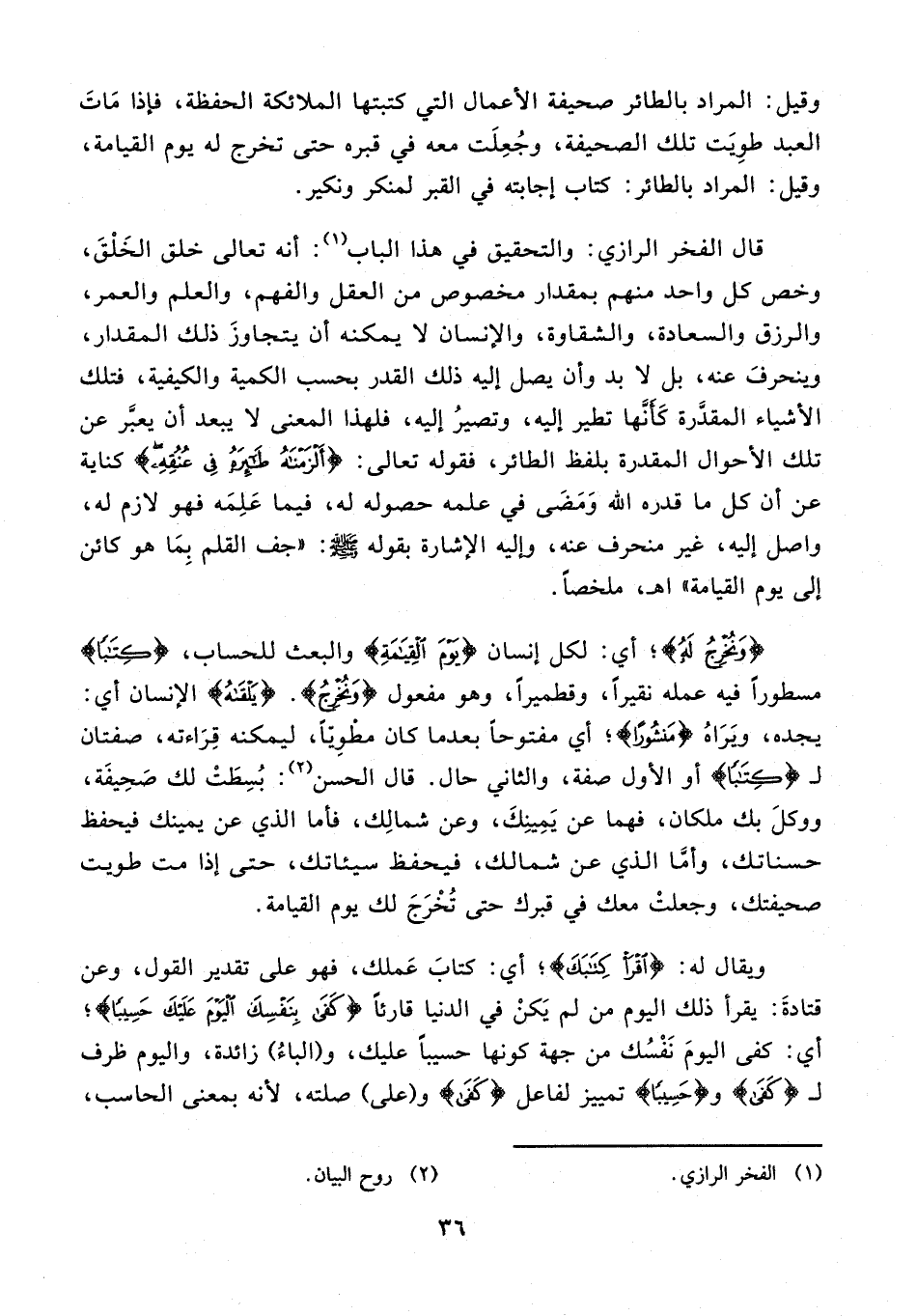 قال الفخر الرازي: والتحقيق في هذا الباب (¬1): أنه تعالى خلق الخلق، وخص كل واحد منهم بمقدار مخصوص من العقل والفهم، والعلم والعمر، والرزق والسعادة، والشقاوة، والإنسان لا يمكنه أن يتجاوز ذلك المقدار، وينحرف عنه، بل لا بد وأن يصل إليه ذلك القدر بحسب الكمية والكيفية، فتلك الأشياء المقدّرة كأنّها تطير إليه، وتصير إليه، فلهذا المعنى لا يبعد أن يعبّر عن تلك الأحوال المقدرة بلفظ الطائر، فقوله تعالى: {أَلْزَمْناهُ طائِرَهُ فِي عُنُقِهِ} كناية عن أن كل ما قدره الله ومضى في علمه حصوله له، فيما علمه فهو لازم له، واصل إليه، غير منحرف عنه، وإليه الإشارة بقوله - صلى الله عليه وسلم -: «جف القلم بما هو كائن إلى يوم القيامة» اهـ، ملخصا.
